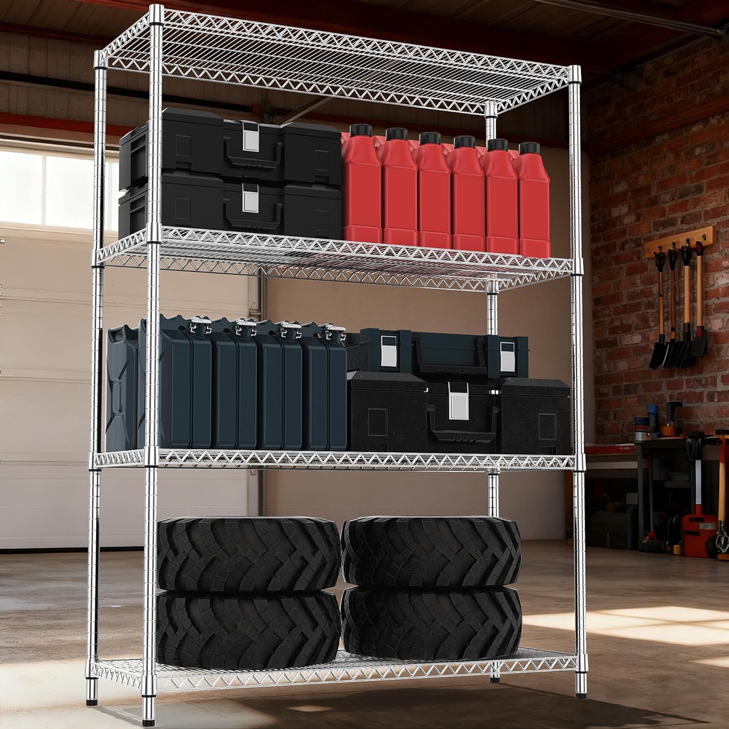 - HEAVY DUTY STORAGE SHELF: Our storage shelf is made of sturdy carbon steel and 25.4mm metal rods and each shelving unit holds up to 660 LBs on leveling feet, with a total bearing capacity of 2640LBs
