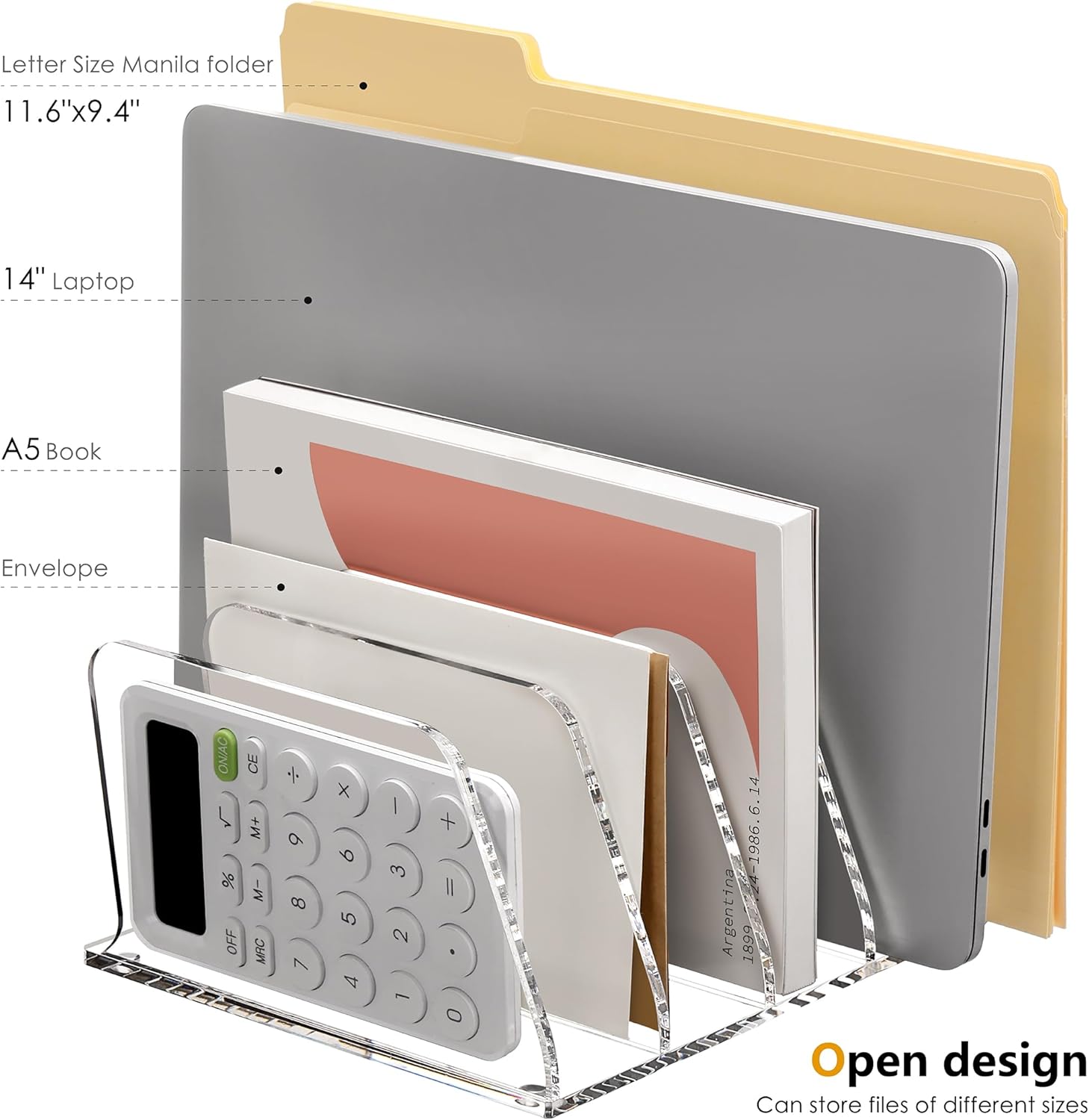 - šļø MAIL ORGANISATION DISTRIBUTION SHELF: This vertical desktop organizer is made of high quality acrylic material and features a fully transparent design that clearly displays the centre tab of each folder, allowing you to locate the folder with just one swipe. Open design, folders can be quickly accessed for storage. Suitable for home, office, school and other places.