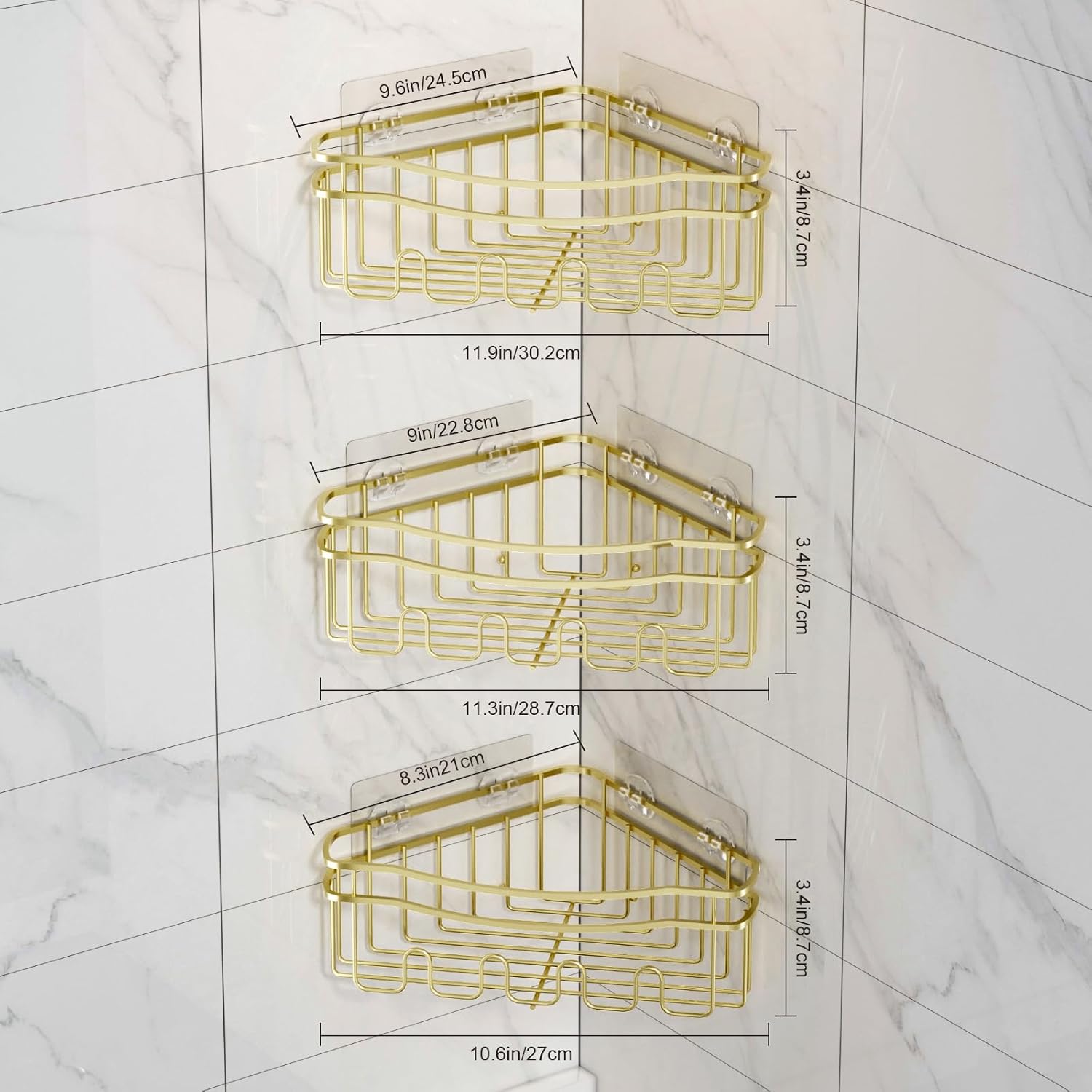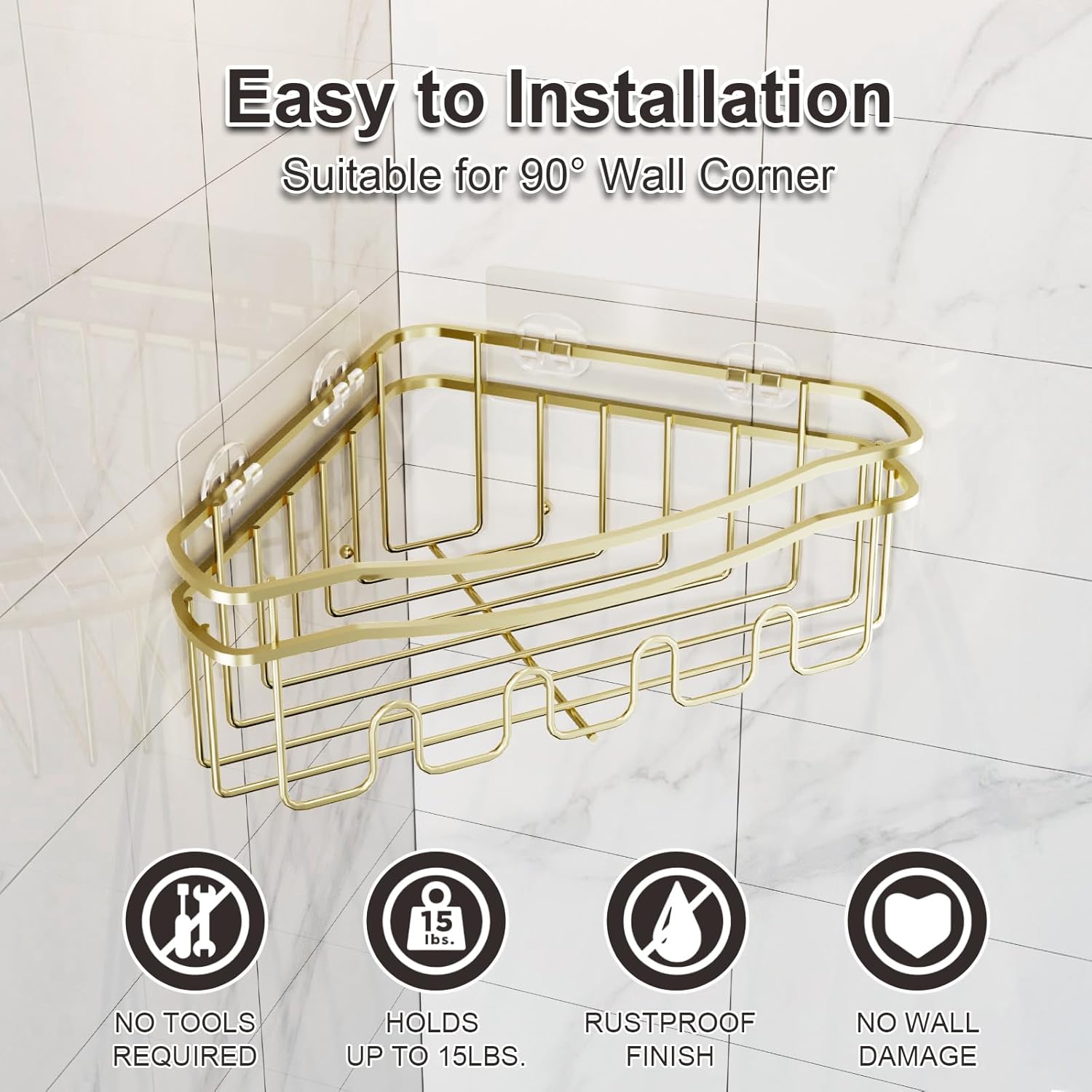 Gold corner shower caddies with depth caddy and Built in 12 hooks rustproof wall mounted No drilling No marring adhesive bathtub corner organizer for bathroom kitchen and laudry room