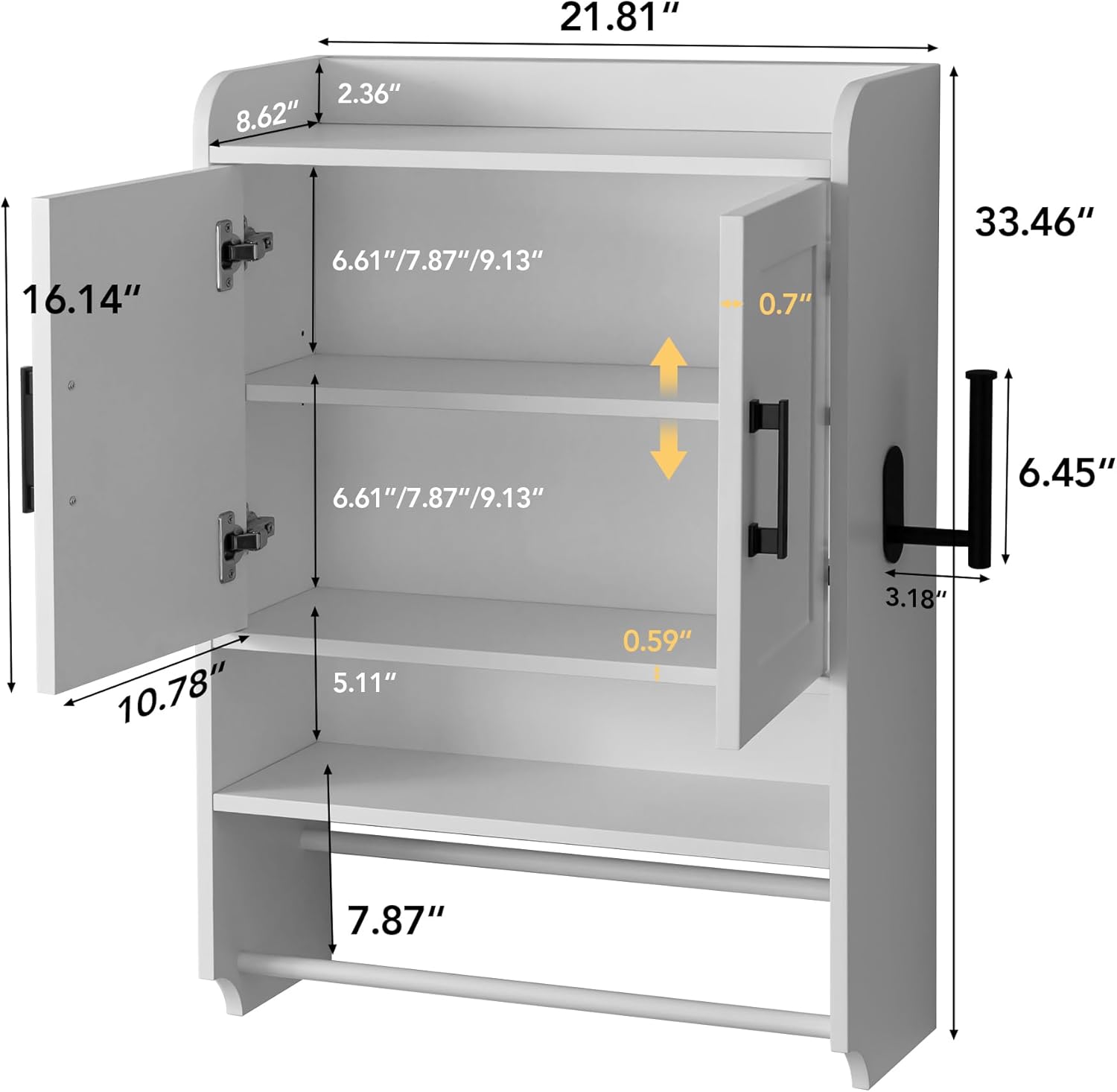 - 【Extra Storage Space】Features a raised top edge to prevent items from falling and maximize unused surface area. The wall cabinet's tissue holder that can be installed on the left or right side. The cabinet's towel bar adds functionality and convenience, making it an ideal storage solution for small bathrooms, kitchens, or laundry rooms