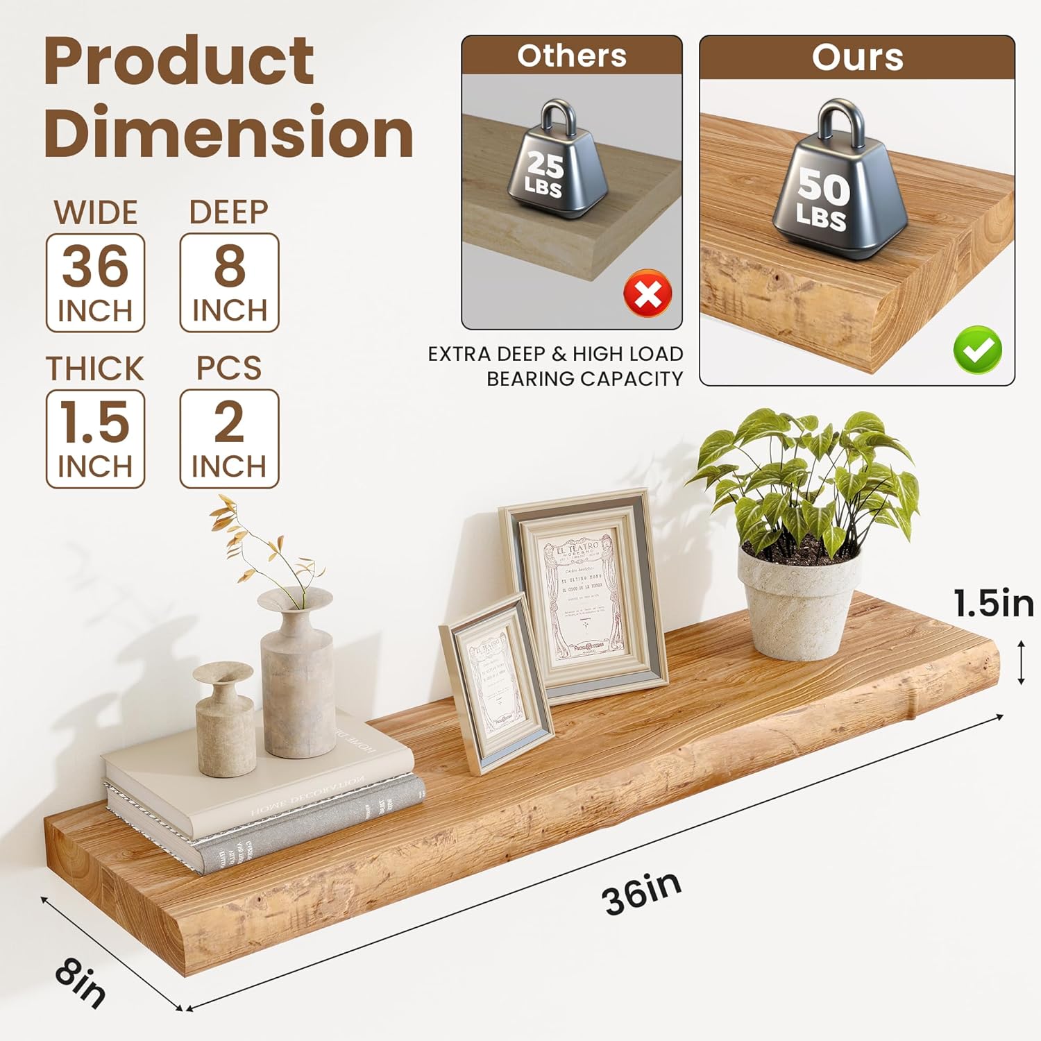 - Size : Live Edge, 36 inch, 2 Packs