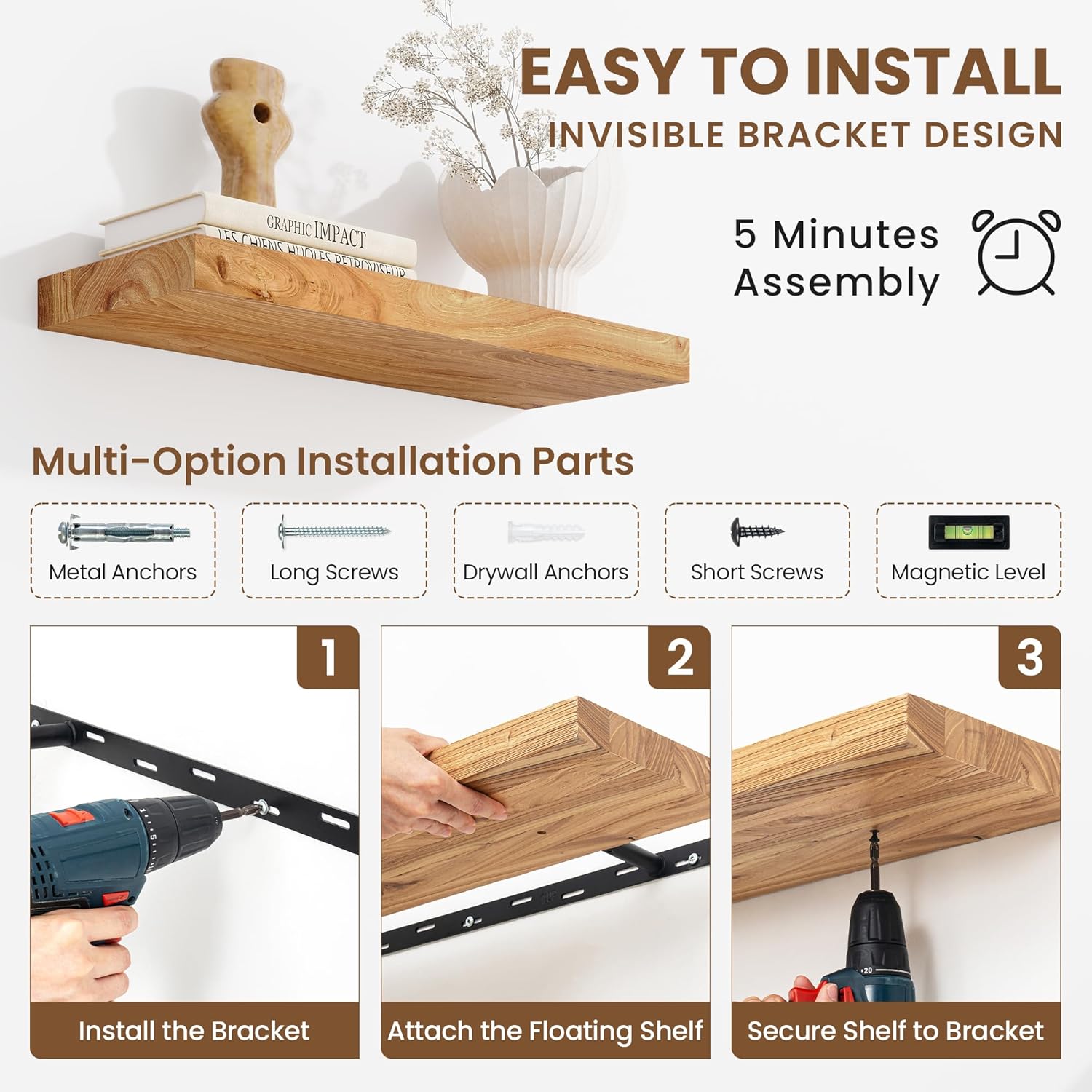 - Premium Solid Elm Wood Construction: Crafted from high-quality, durable solid elm wood, these floating shelves offer a natural wood grain finish that adds warmth and elegance to any space. The sturdy material ensures long-lasting use while maintaining its aesthetic appeal.