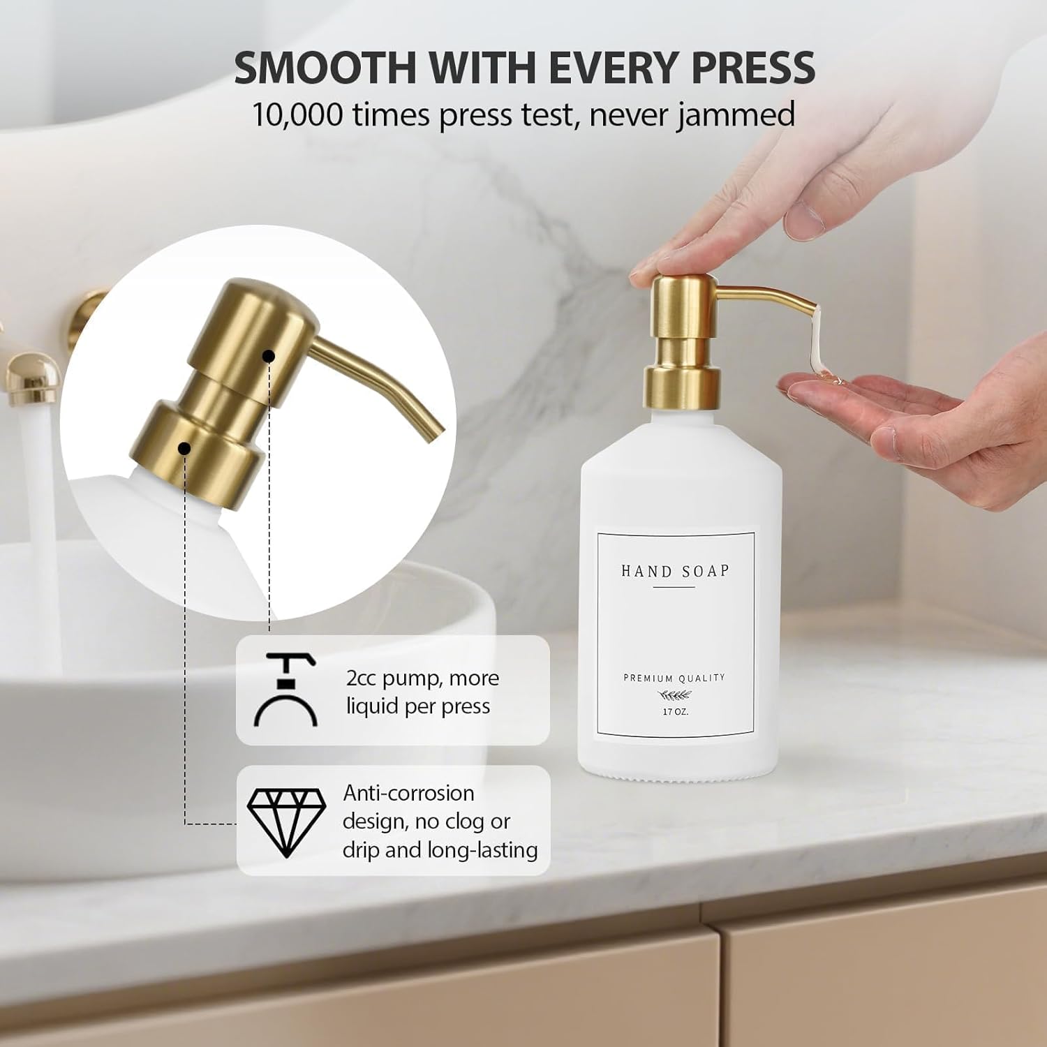 - 【No Leaks, No Rust, No Yellowing】Ditch fragile, low-quality dispensers for good. Our kitchen soap dispenser set features thicker glass and a rust-proof pump tested over 10,000 times for smooth, leak-proof daily use. 17oz capacity reduces refills, and the included collapsible funnel ensures a perfectly clean refill every time