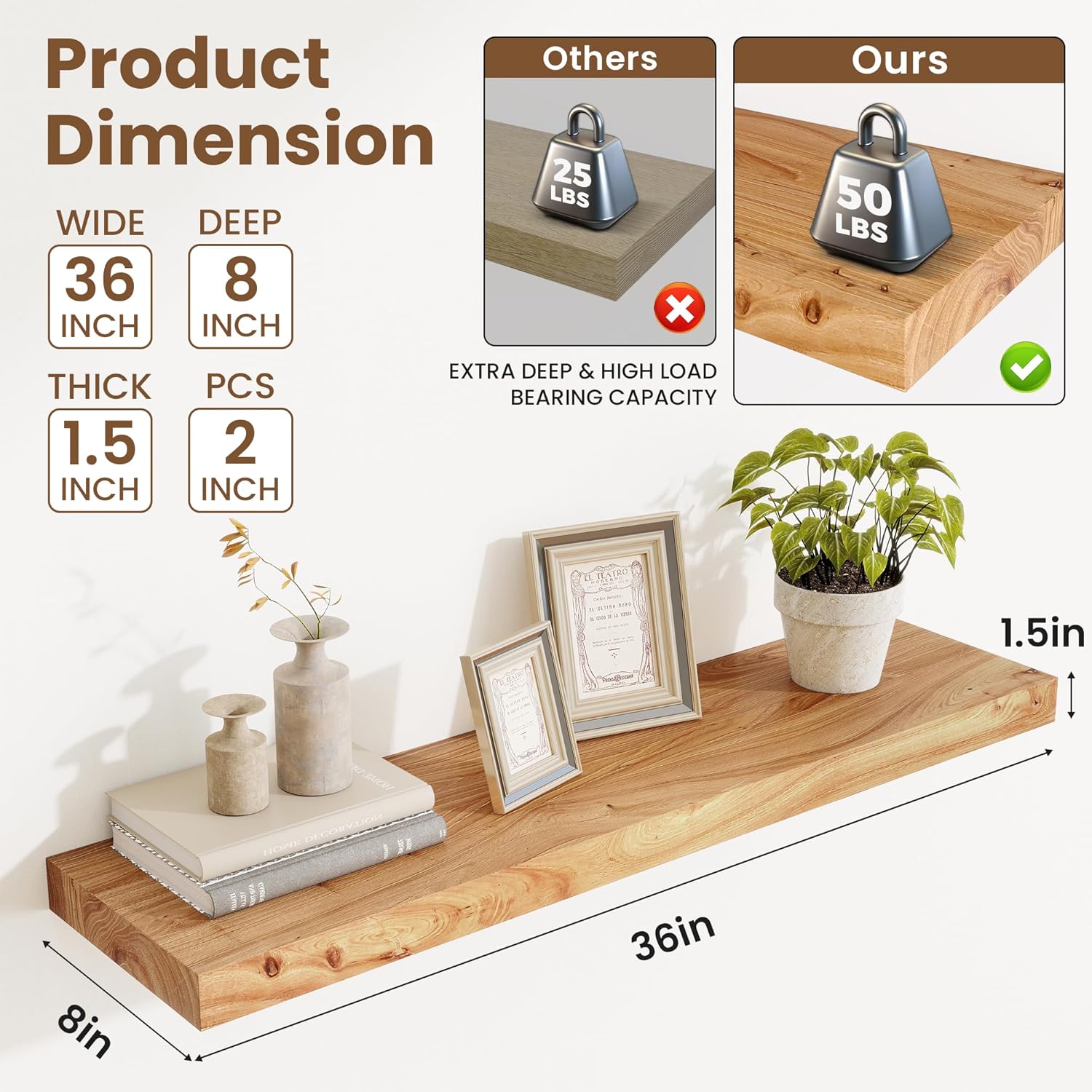 Floating Shelves, 8" Deep Rustic Solid Elm Wood Wall Mounted Floating Shelves, Wall Shelves with Invisible Bracket for Living Room Bathroom Bedroom Kitchen, 36 Inch Set of 2, Natural