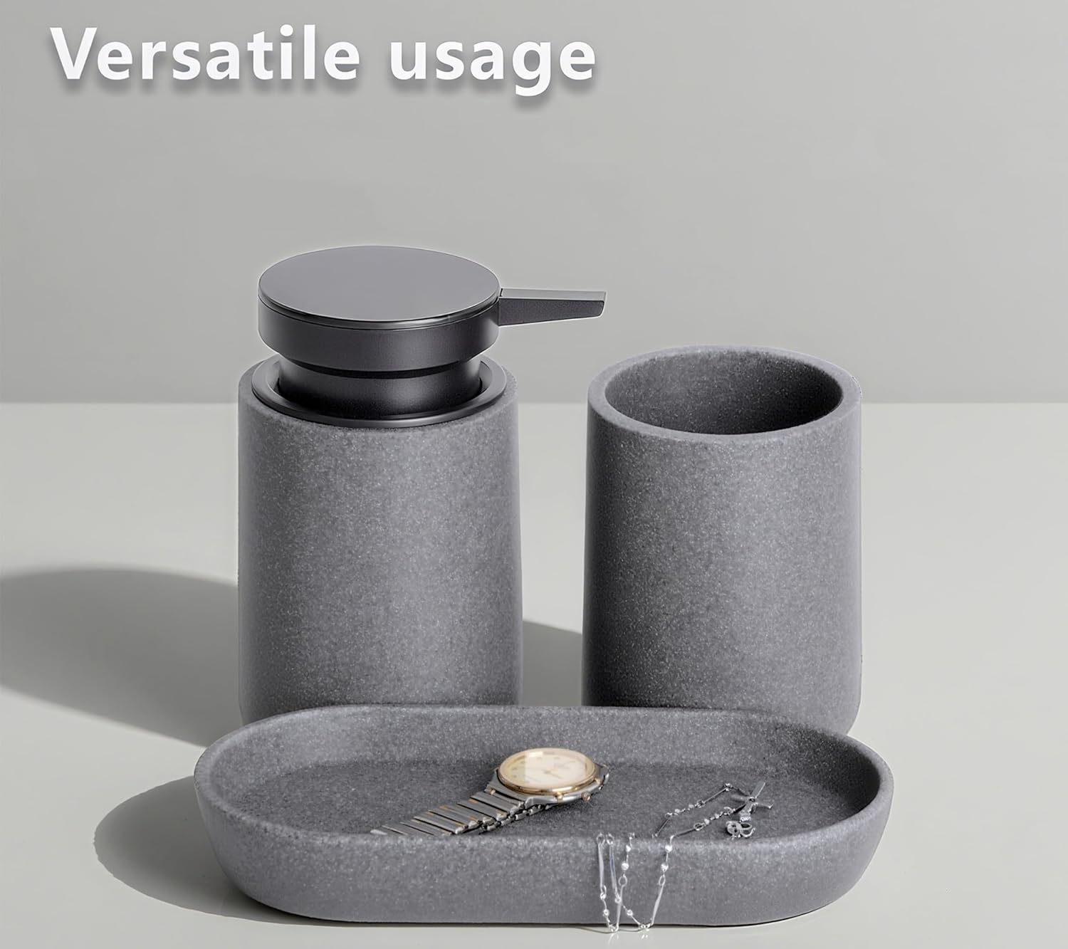 3 Pcs Bathroom Accessories Set, Liquid Soap Dispenser with Large Pump, Toothbrush Holder Cup and Soap Dish, Sandstone Texture Bathroom Counter Set for Modern Home (Gray)