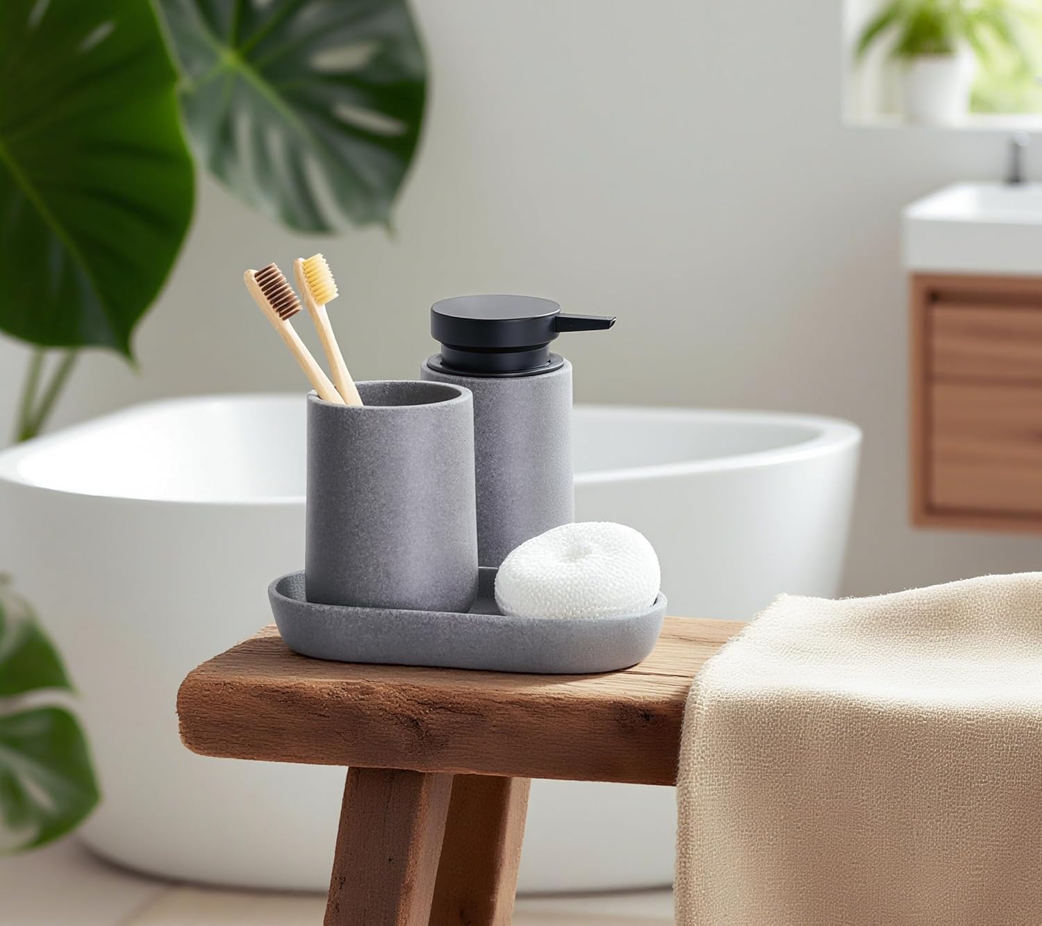 - COMPLETE SET: All-in-one bathroom accessories set includes soap dispenser with upgraded easy-to-press pump, toothbrush holder cup, and soap dish that doubles as a tray for rings or small items. This complete set offers everything you need for a tidy bathroom setup.