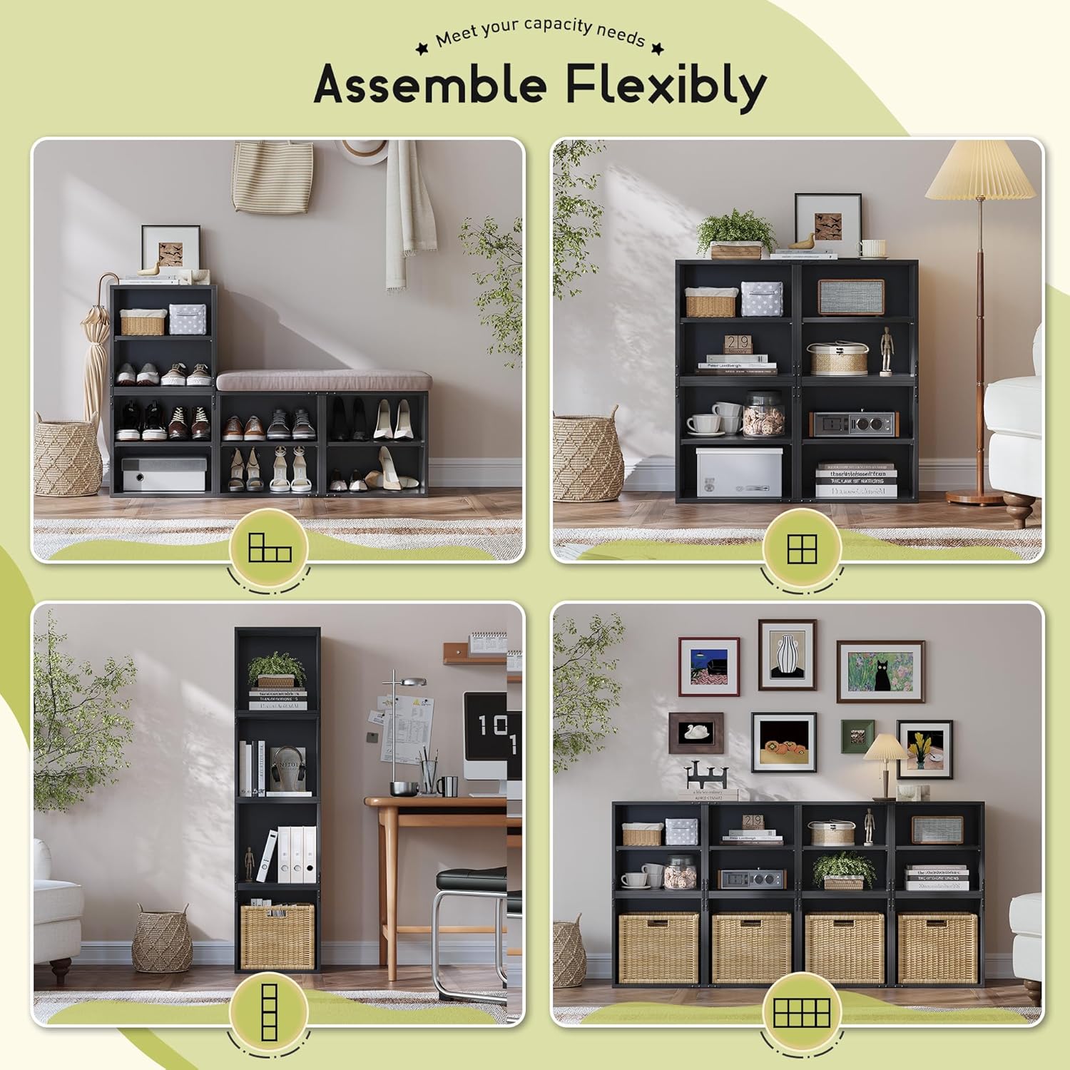 - 【Stack the Style】Get creative with these 15" storage cubes that transform to fit life! Stack this cube storage organizer tall as a bookshelf, line them up as a media console, or split them between rooms. The open design keeps everything accessible.This cube provides three styles: open, shelved, or door cubes. Combine basic, shelf, and door cubes to build storage setup with versatile styling options.Stay organized and efficient—great for school, dorm, or home workspace