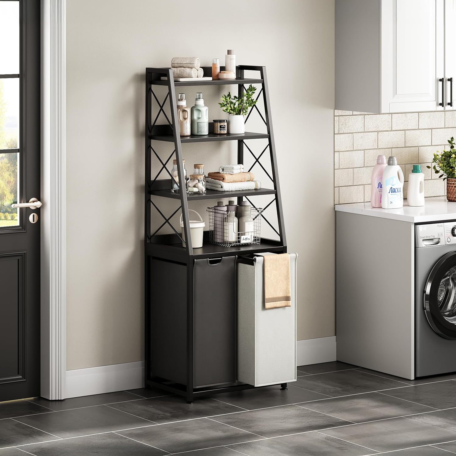 Laundry Basket, 2 Section Laundry Hamper with 4 Tiers Shelf, Pull-Out and Removable Laundry Bags, Large 2 x 15.87 Gallons, for Bedroom Bathroom Black PF11XLK