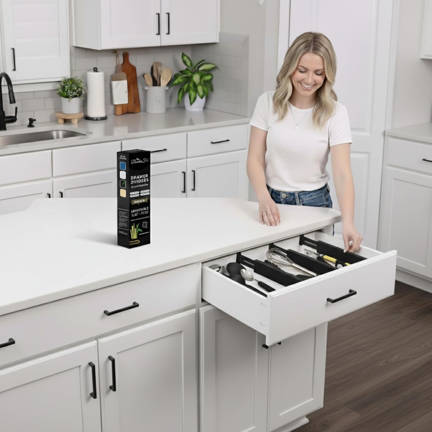 - 【Adjustable Fit for All Drawers】 – Expandable 11.8–17.1" spring-loaded dividers with lock stay tight in kitchen, dresser, bathroom or office drawers; use horizontally or vertically for a custom layout