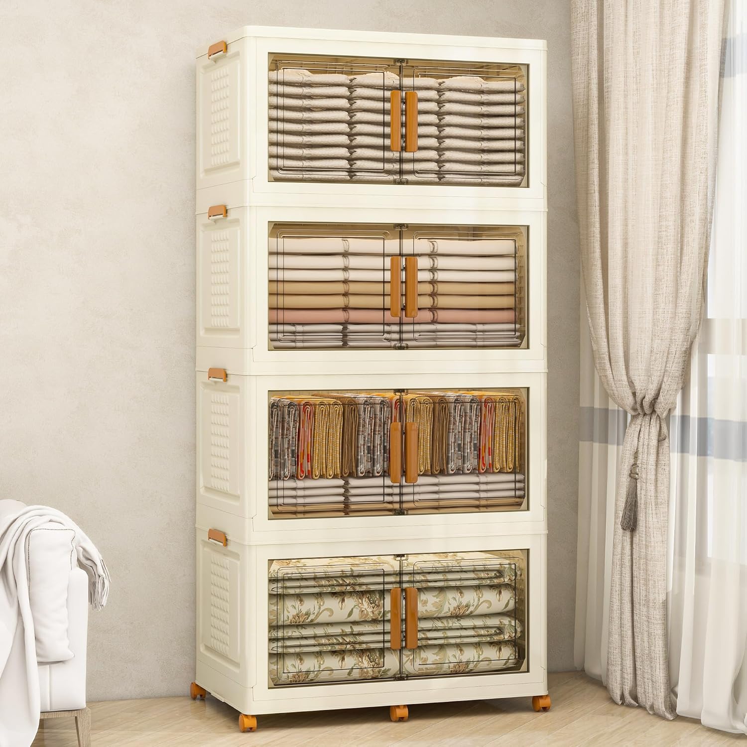 Plastic Stackable Storage Bins with Lids and Wheels, Foldable Closet Organizers and Storage Containers, Collapsible Clear Drawer Storage Cabinet with Doors White 152Gal