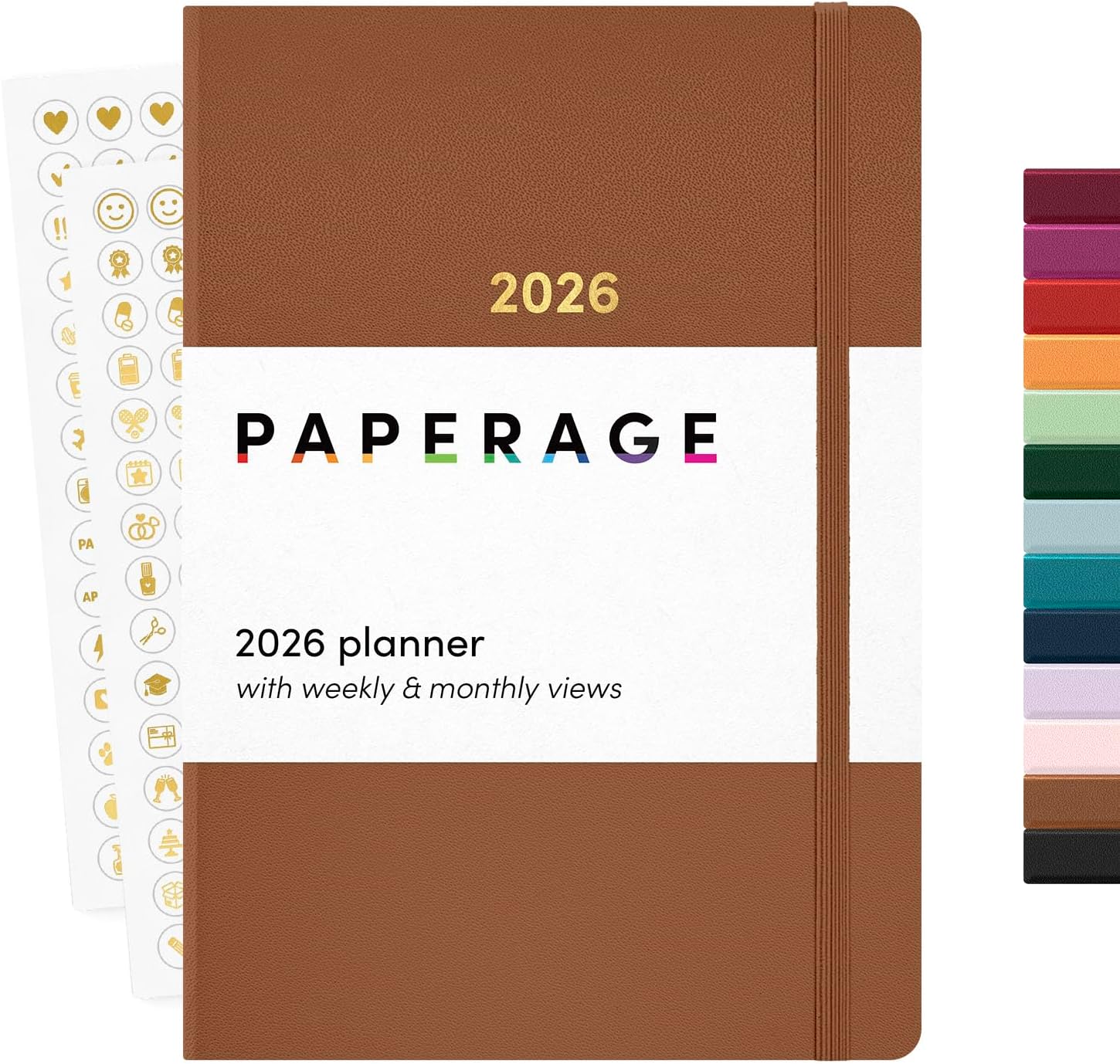 PAPERAGE 2026 Weekly & Monthly Planner, 12 Months (January 2026 - December 2026), 5.6 in x 8 in, Hardcover 2026 Planner with Weekly & Monthly Spreads, Note Pages, Stickers & Back Pocket – Cognac