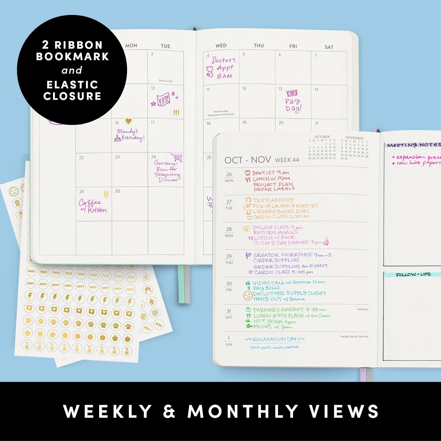 - SUPERIOR CONSTRUCTION: Expertly crafted with style and utility in mind, this planner includes a lay-flat binding, elastic band closure, 2 satin ribbon bookmarks, dotted pages for notes, back pocket & sticker labels to personalize your planner.