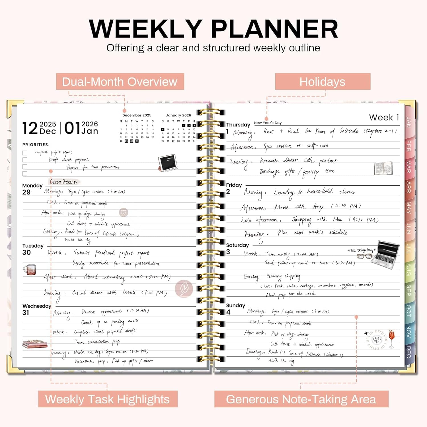 - 2026 PLANNER WEEKLY AND MONTHLY: Each monthly spread has large date boxes for marking appointments, agendas, key dates, and bills due. Weekly two-page spreads offer generous lined space for detailed planning—helping track priorities and daily tasks effectively.