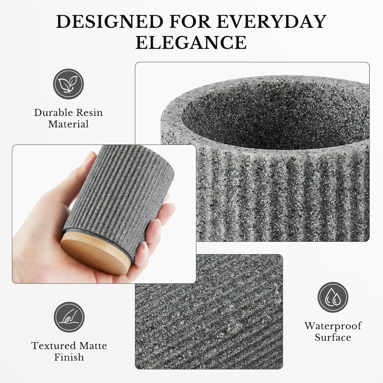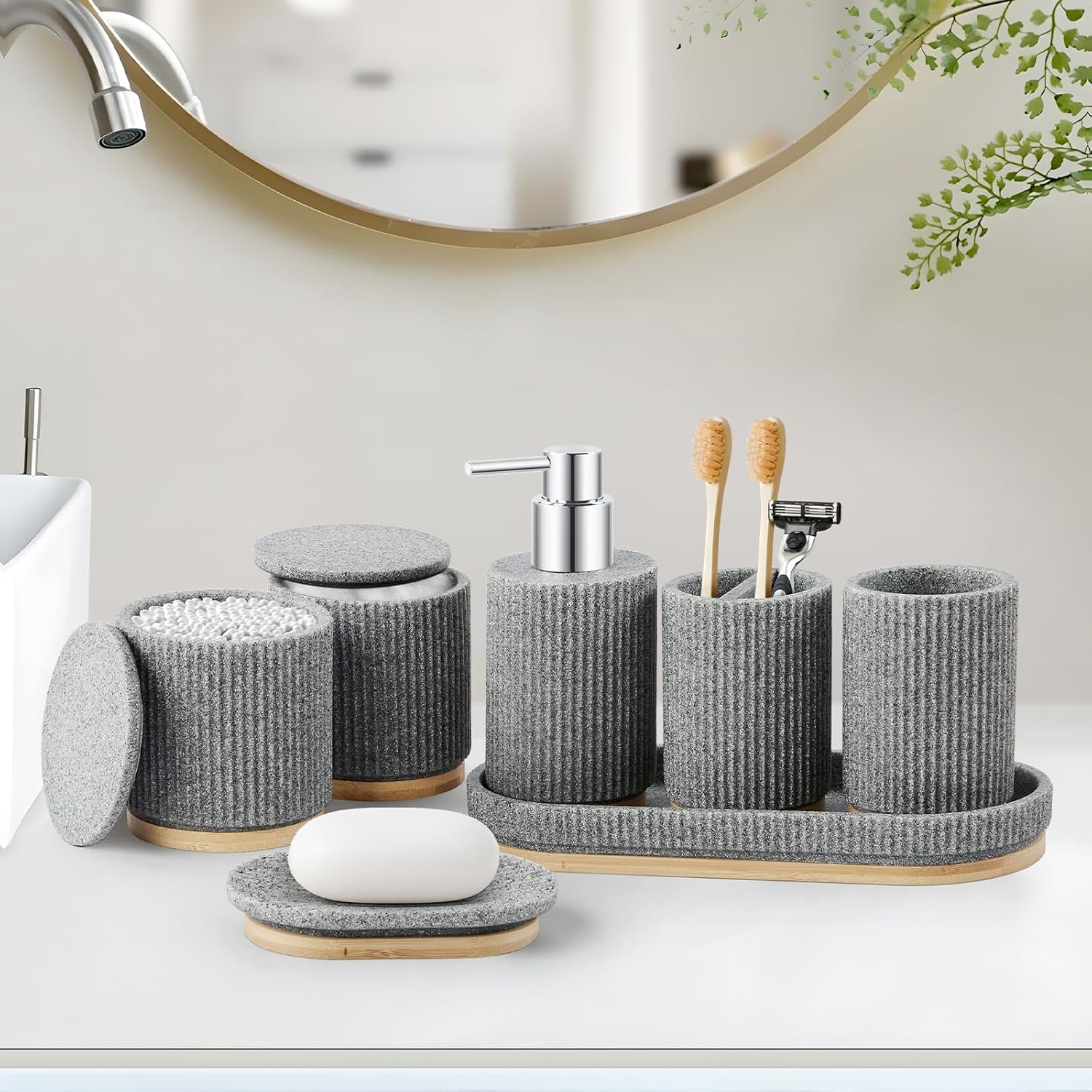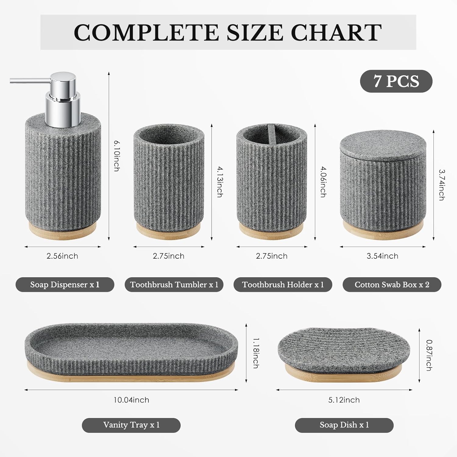Bathroom Accessories Set, 7PCS Resin Bathroom Set with Bamboo Base, with Soap Dispenser, Q-tip Holder, Toothbrush Holder, Tumbler, Soap Dish, Vanity Tray, Complete Bathroom Set for Modern Decor,Grey