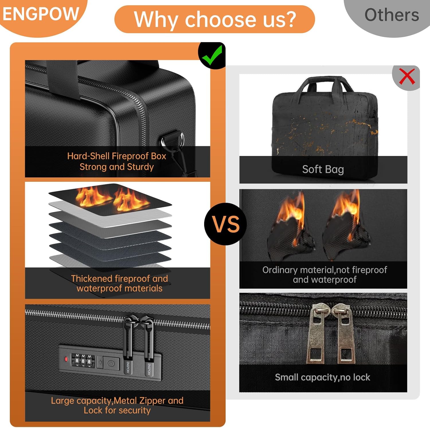 - Upgraded UL-94 VTM-0 Certified Fireproof Box: Keep your valuables safe with ENGPOW fireproof document box. It is made of 2mm premium fire-retardant, non-itchy silicone-coated fiberglass, thickened fireproof materials and hard-shell material which can stands up against fire and passed the UL classified and SGS TEST (UL-94 VTM-0 Burning Test). A Safe Enough Box to Keep Your Important Documents