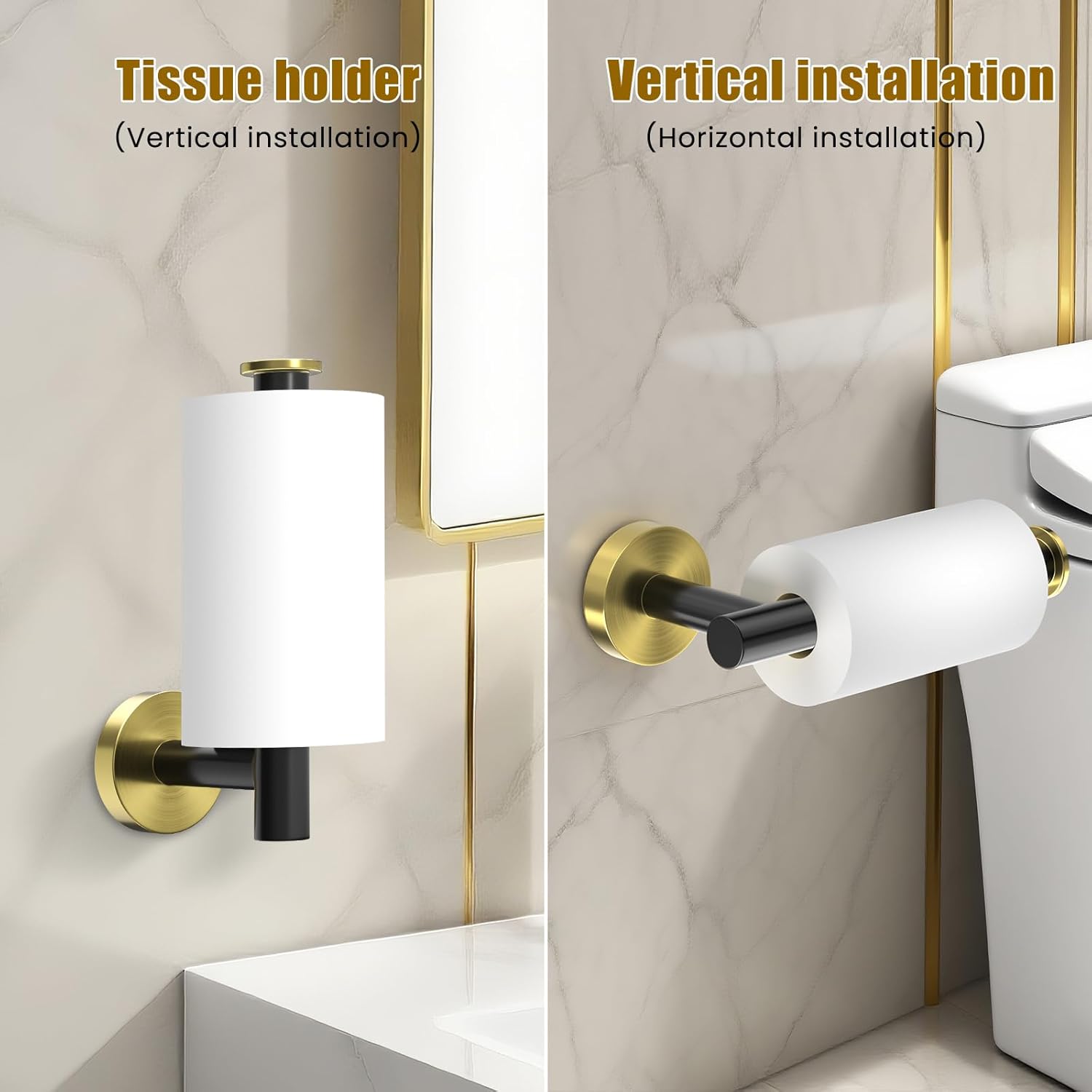 5 Pcs SUS304 Stainless Steel Bathroom Accessories Set, 24" Towel Bar, Round Towel Ring, Toilet Paper Holder, 2 Towel Hooks, Minimalist Design for All Styles Bathrooms (Black+Gold)