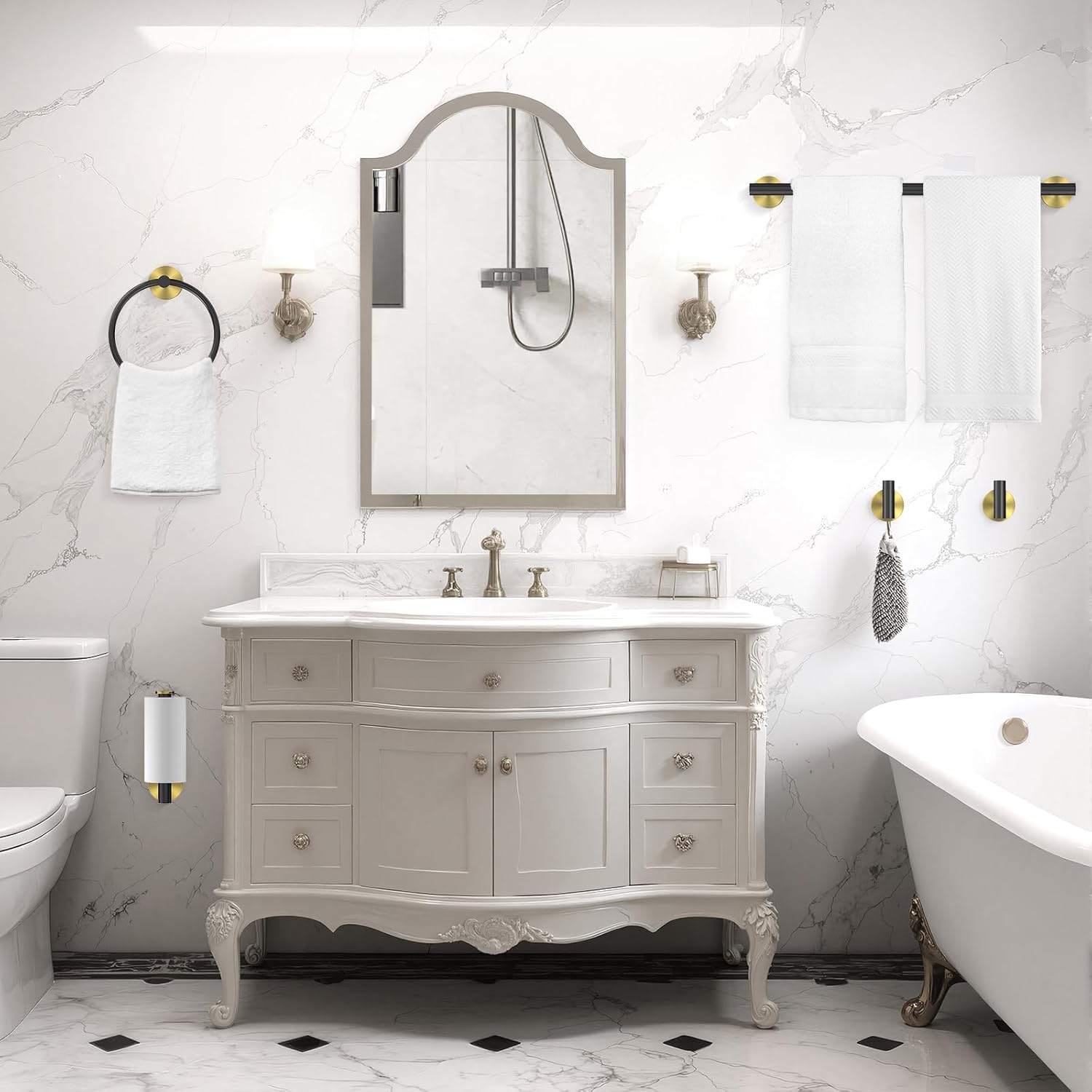 - 【5-Piece Bathroom Accessories Set】Includes 1 x 24" towel bars, 1 x round towel rings, 2 x towel hooks, and 1 x toilet paper holders. This all-in-one solution meets all your bathroom accessory needs. Maximize your bathroom space with clutter-free organization.