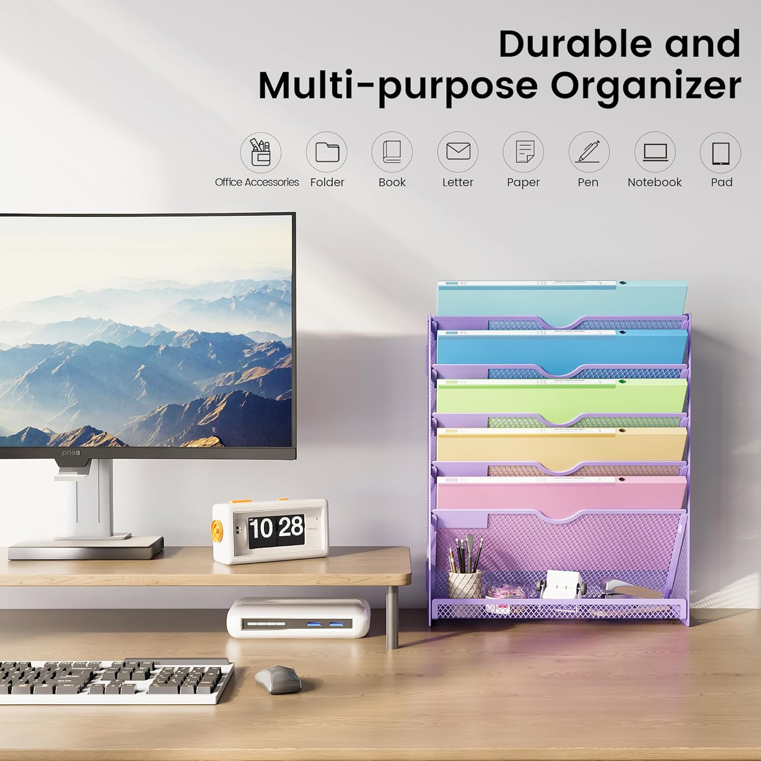 Hanging Wall File Organizer for Wall Mounted Mail Paper Folder Holder Document Organization Stand Desk File Organizer Tray for Office & Home Cubicle Countertop 6 Tier Purple