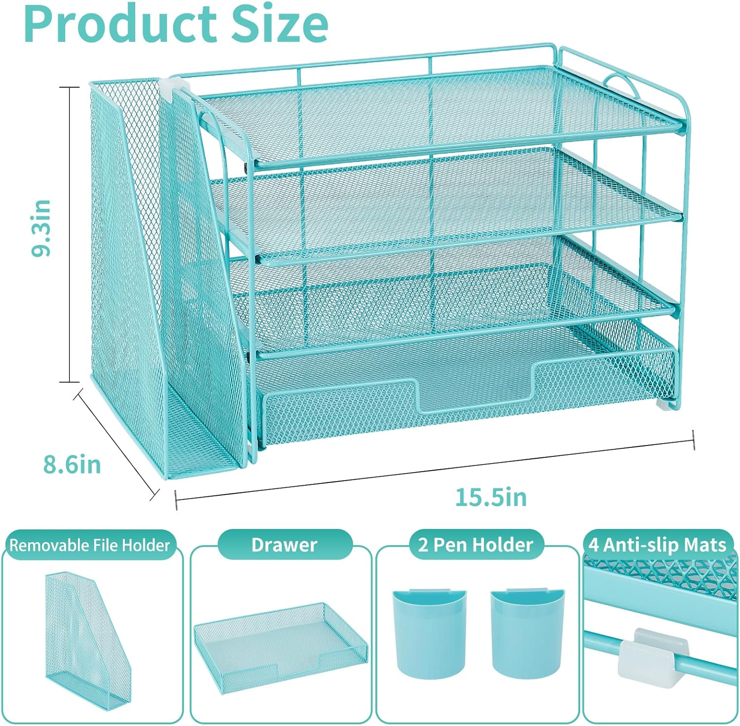 Desk Organizer and Accessories, 4-Tier Desktop File Organizer with Drawer and 2 Pen Holders, Office Desk Accessories, File Sorters, Workspace Organizers for Office Supplies(Teal Blue)