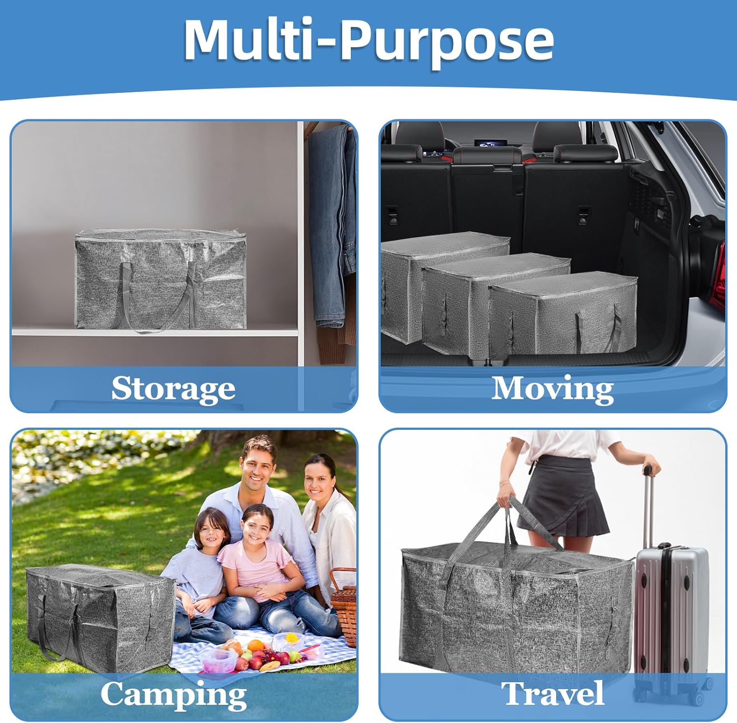 4 Pack-Extra Large Heavy Duty Moving Bags - Waterproof Storage Totes with Handles & Zippers, Foldable for College Dorm, Storage (Gray)