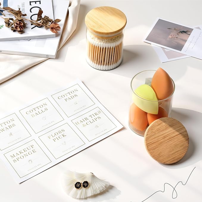 - Waterproof Label Stickers: Our cotton ball holder comes with 6 label stickers, making it easy for you to categorize and organize the items. The surface of the stickers is coated with a waterproof layer, so they are not easily affected by moisture or damaged. Cotton swab container are perfect for use in humid bathrooms and kitchens.