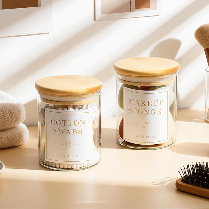Luxspire 2 Pack Glass Qtip Holder Dispenser, 13.4 oz Cotton Swab Holder with Bamboo Lids, Glass Apothecary Jars Bathroom Accessories Canisters for Cotton Swabs, Balls, Pads, Floss Picks
