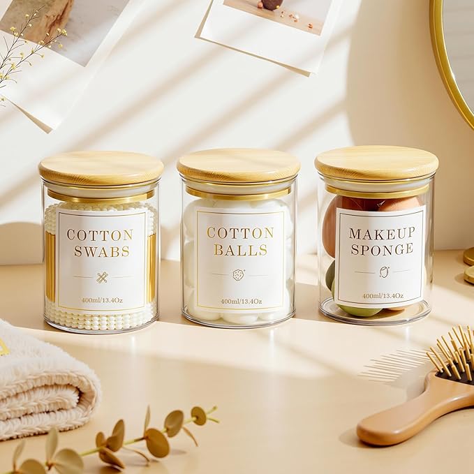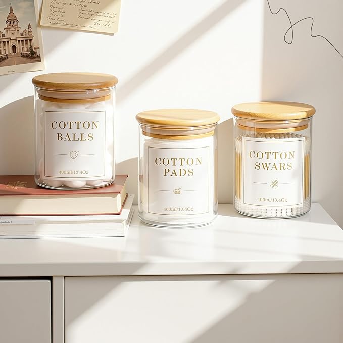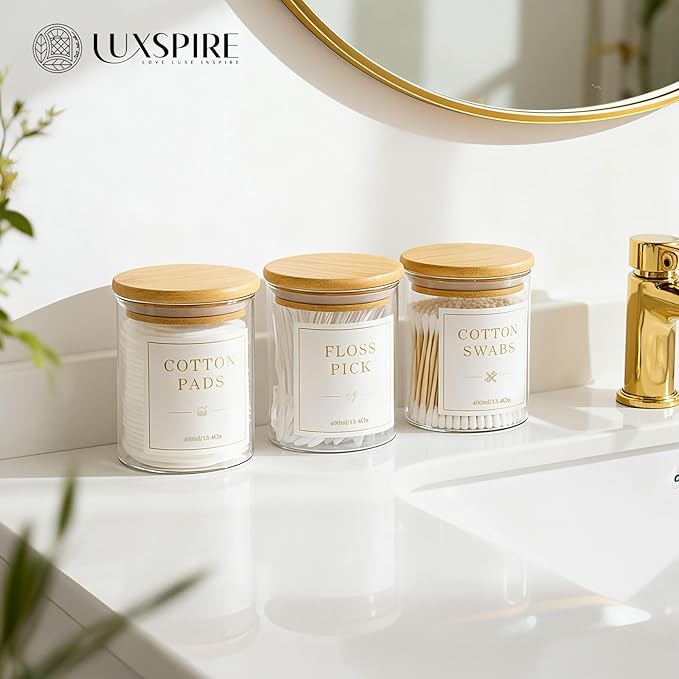 Luxspire 3 Pack Glass Qtip Holder Dispenser, 13.4 oz Cotton Swab Holder with Bamboo Lids, Glass Apothecary Jars Bathroom Accessories Canisters for Cotton Swabs, Balls, Pads, Floss Picks