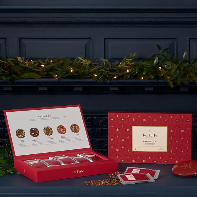Tea Forte Warming Joy Hoilday Premium Single Steeps Loose Leaf Tea Gift Set Sampler, 15 Count 3 of Each Assorted Blends, Pre-Portioned Single Serve Pouches, Steeps 12 oz
