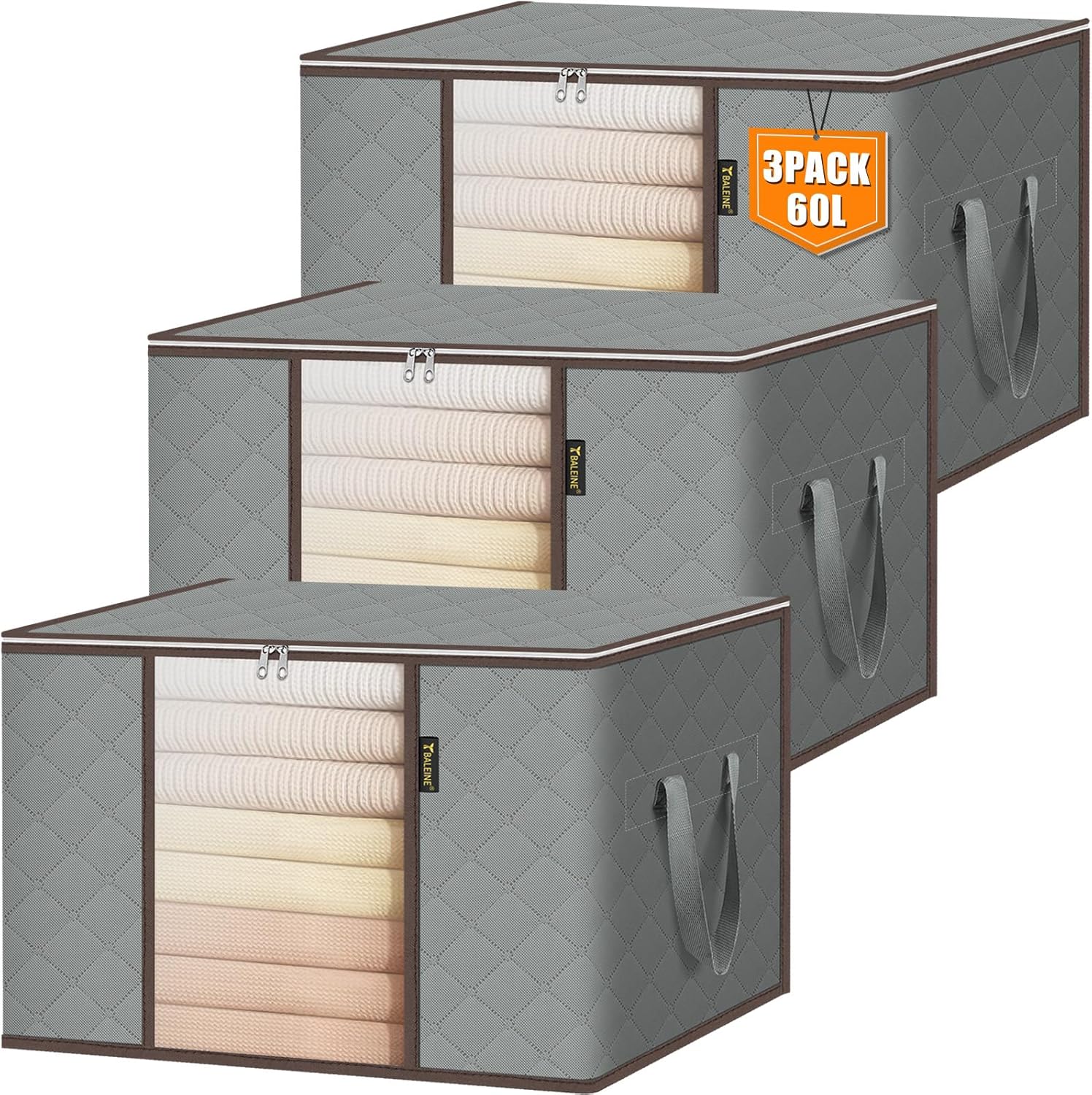 BALEINE 3 Pack Clothes Storage Bags, 16 Gallon Storage Containers with Reinforced Handle, Sturdy Zipper, Closet Organizer for Blanket, Comforter, Pillow, Bedding (Grey, 3 Pack)