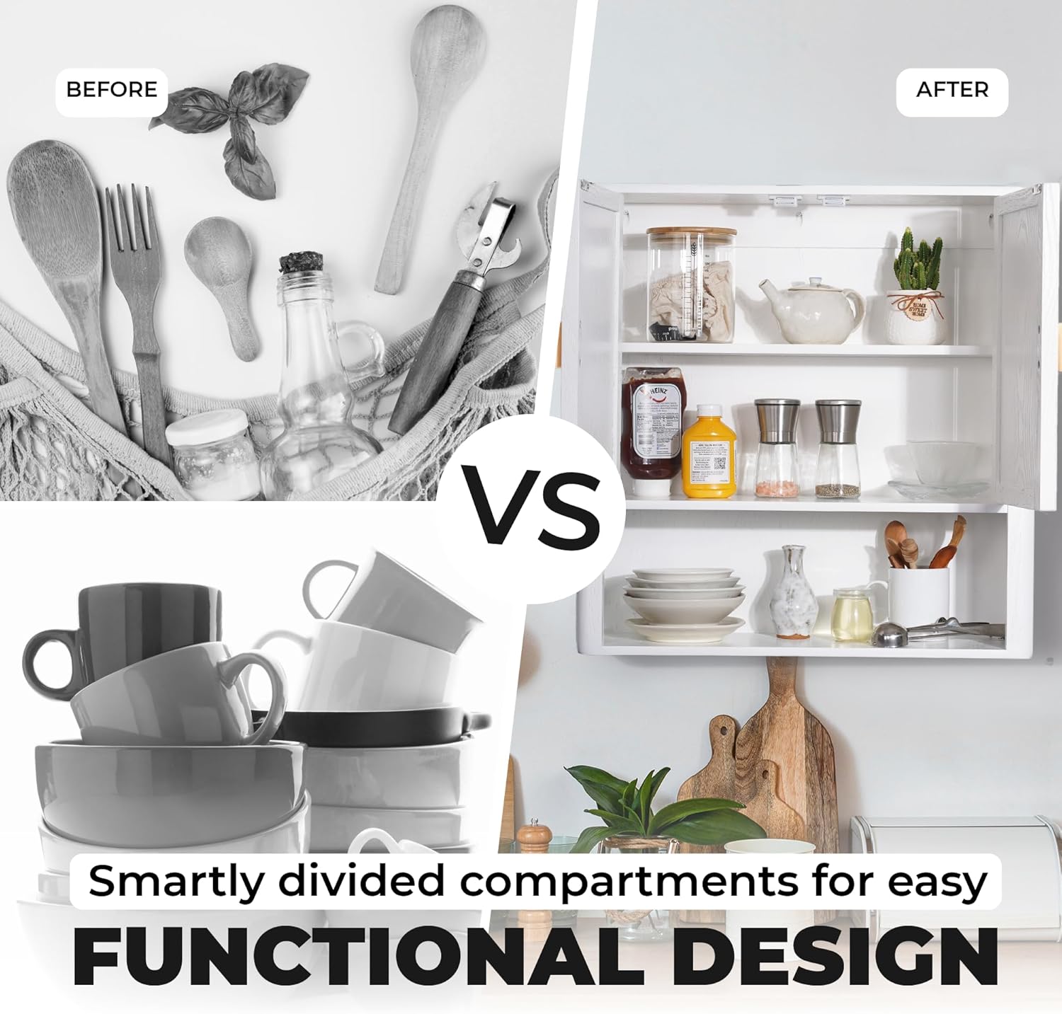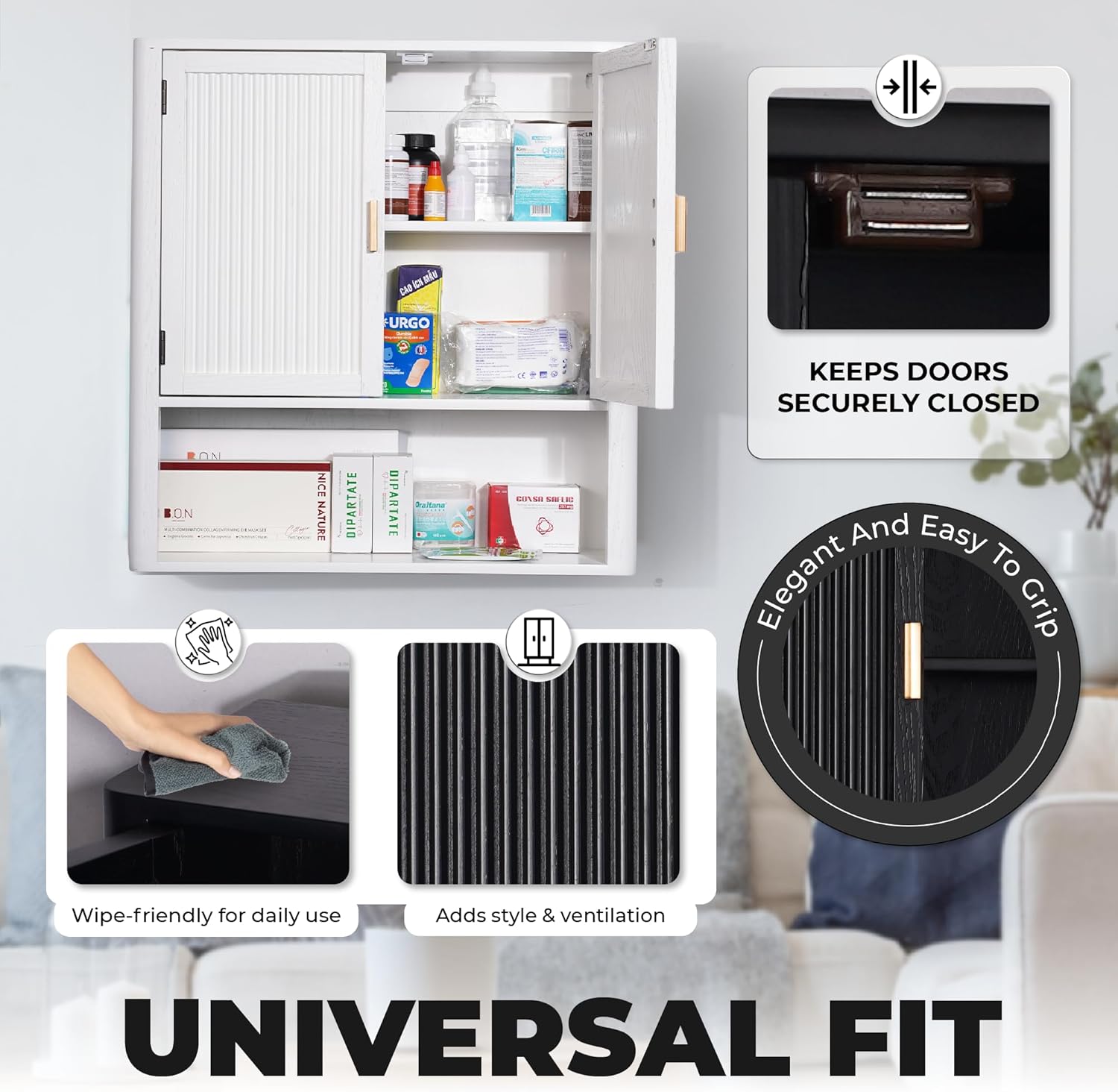 - Fixed Shelf & Dual Doors for Organized Storage: A non-adjustable internal shelf creates two separate compartments behind sleek magnetic-close doors – ideal for keeping items tidy and out of sight.