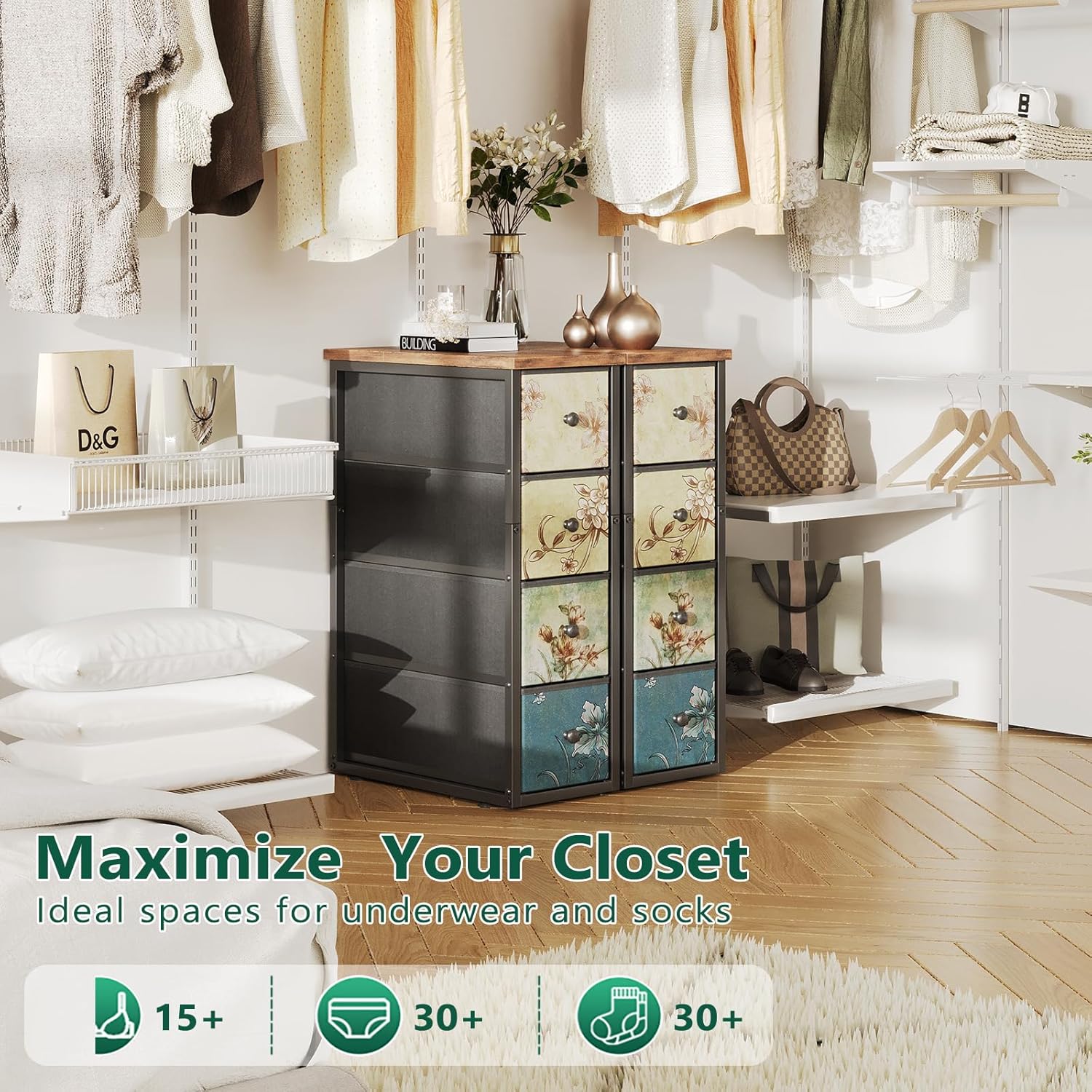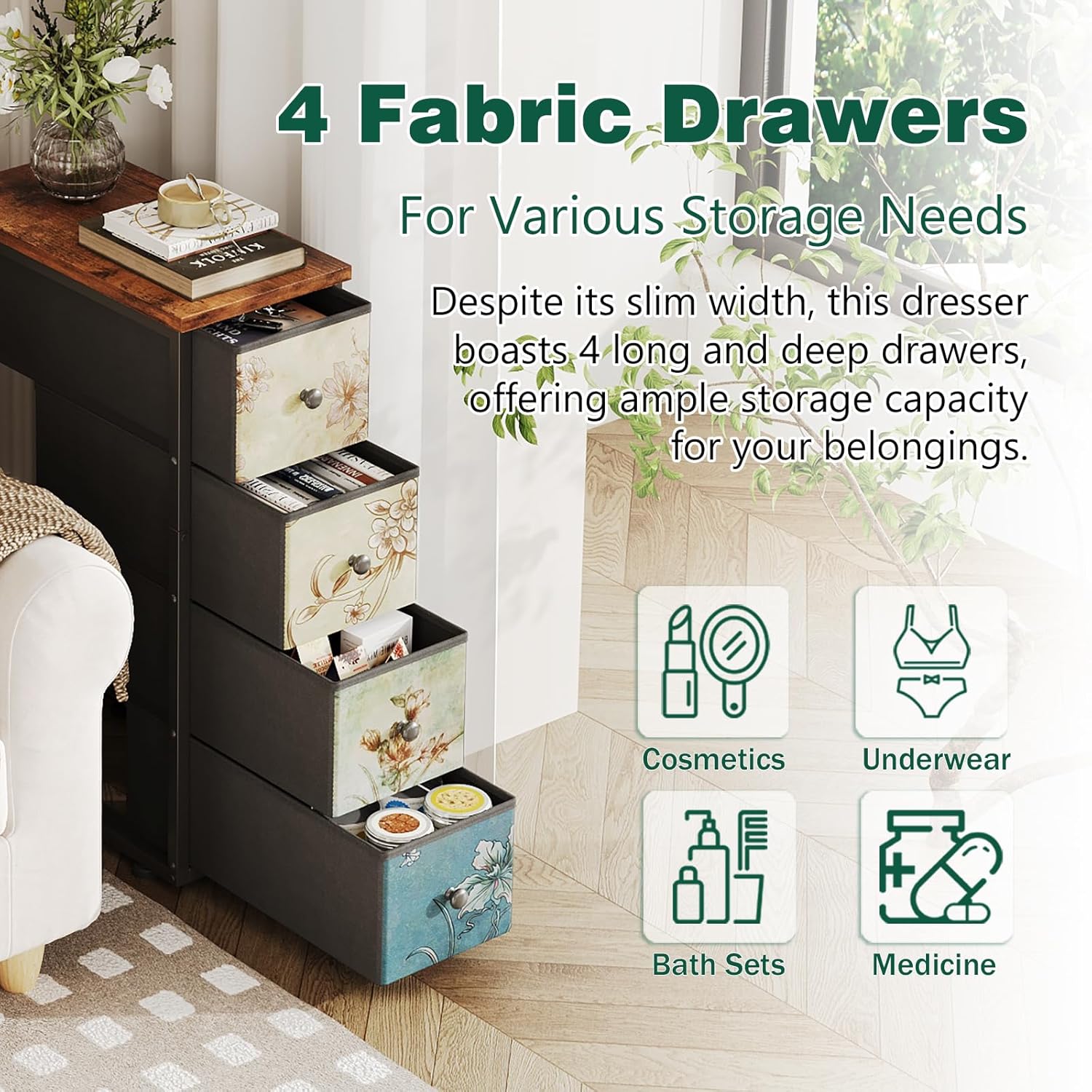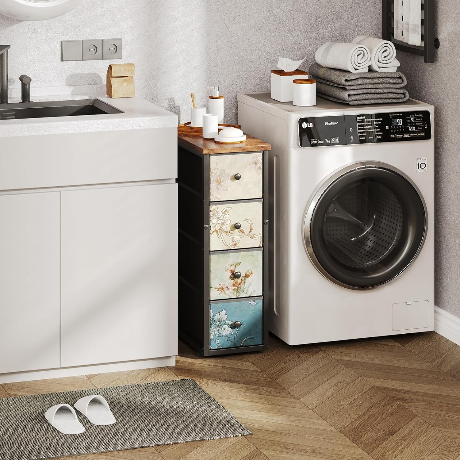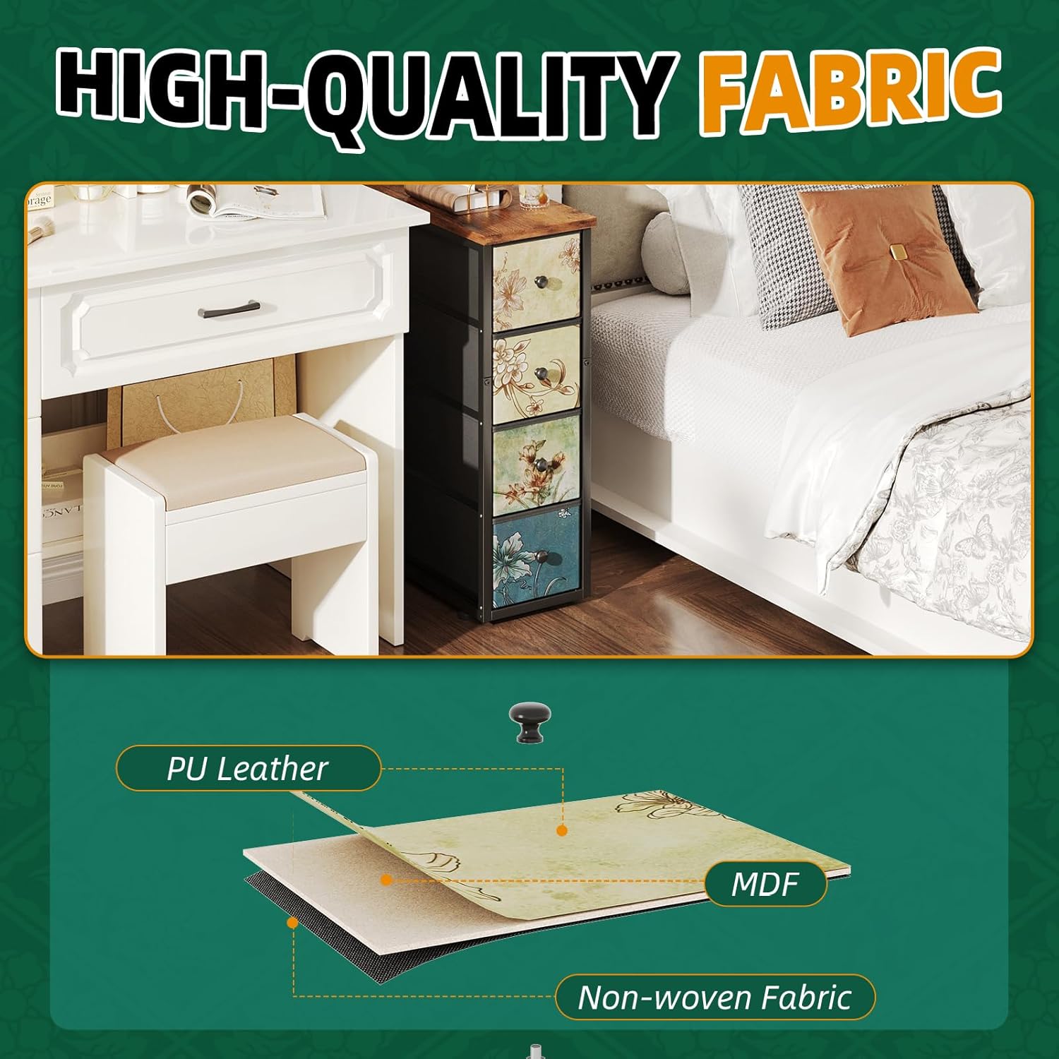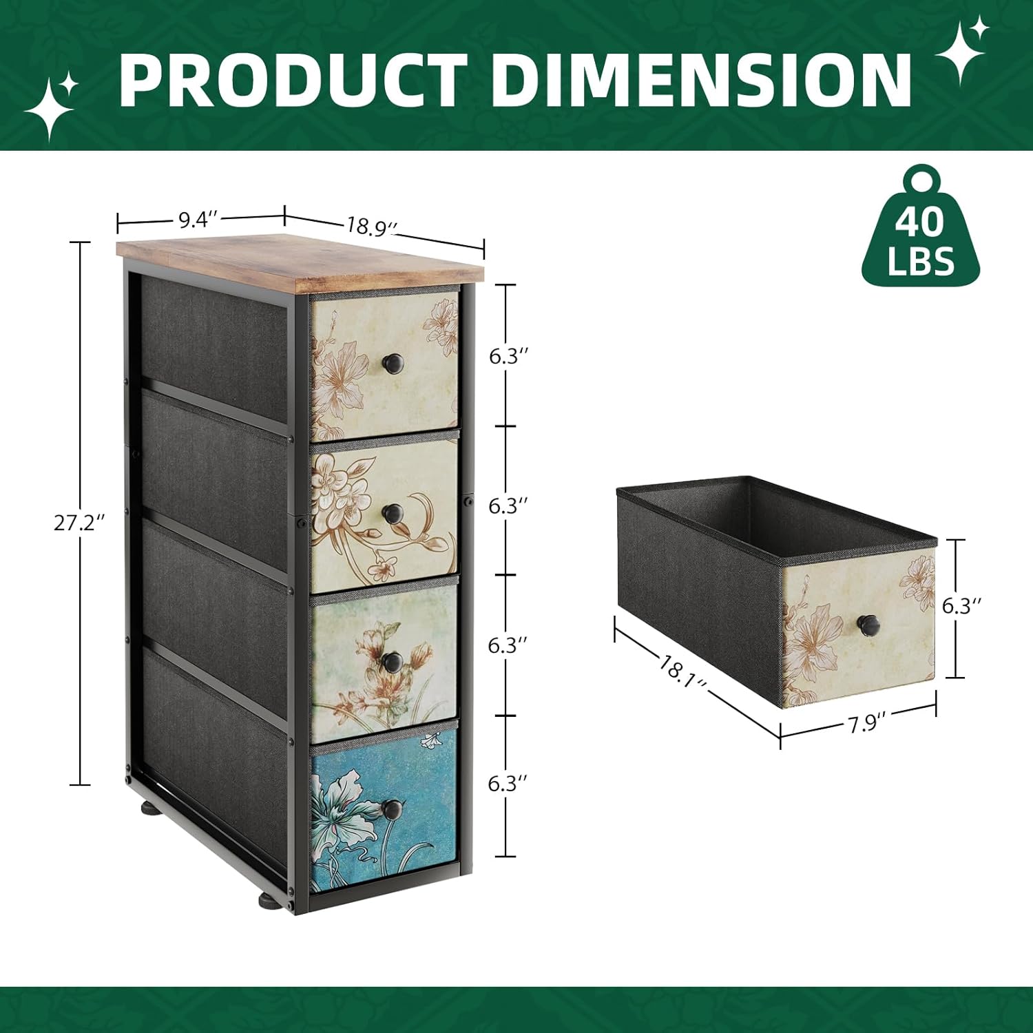 Narrow Dresser, Narrow Nightstand Dresser Storage Tower with 4 Drawers, Slim Fabric Dressers Chest of Drawers for Small Spaces, Retro Flower Dressers, for Bedroom Bathroom Laundry Closet, Vintage