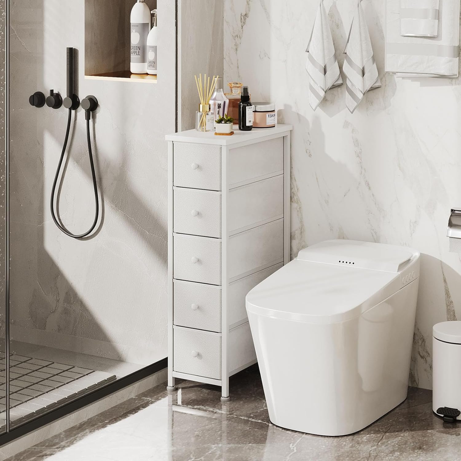 Narrow Dresser, 19" Wide Narrow Nightstand Dresser Storage Tower with 5 Drawers, Slim Fabric Dressers Chest of Drawers for Small Spaces, Wood Top & Fabric Bins for Bedroom Bathroom Closet (White)