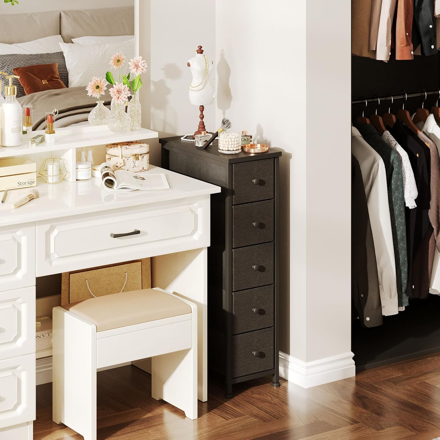 Narrow Dresser, 19" Wide Narrow Nightstand Dresser Storage Tower with 5 Drawers, Slim Fabric Dressers Chest of Drawers for Small Spaces, Wood Top & Fabric Bins for Bedroom Bathroom Closet (Black)