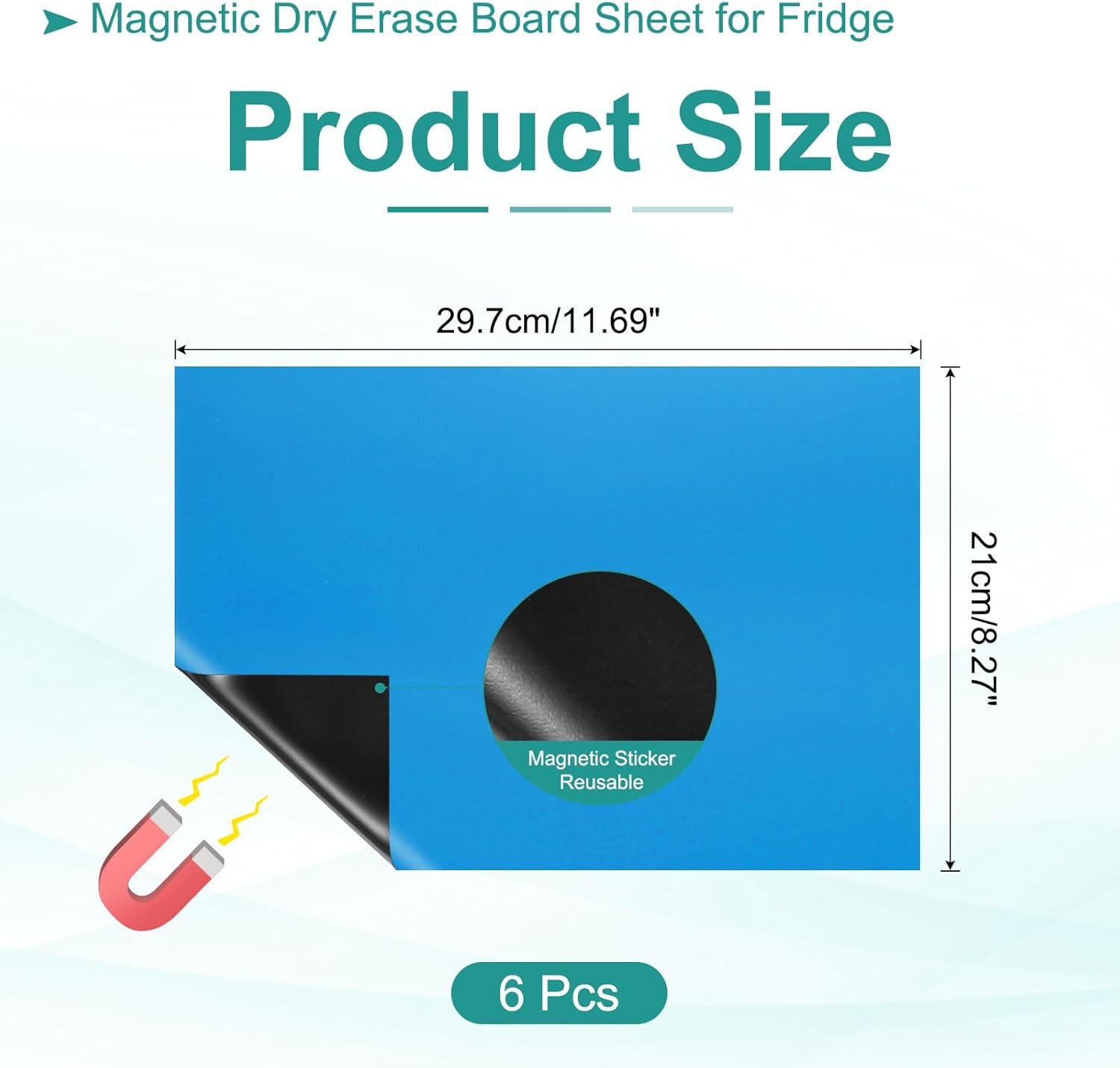 - Color: Blue; Material: Rubber; Thickness: 0.6 mm / 0.02 inch; Dimension: 29.7 x 21 cm / 11.69 x 8.27 inches (L*W); Package List: 6 Pcs x Magnetic Dry Erase Board Sheet for Fridge