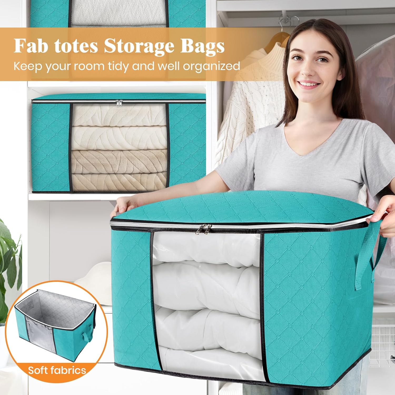 Fab totes 24 Gallons Clothes Storage, Foldable Thick Fabric Blanket Storage Bags, Containers for Organizing Bedroom, Closet, Clothing, Comforter, Organization with Handle (4 Pack,Green)