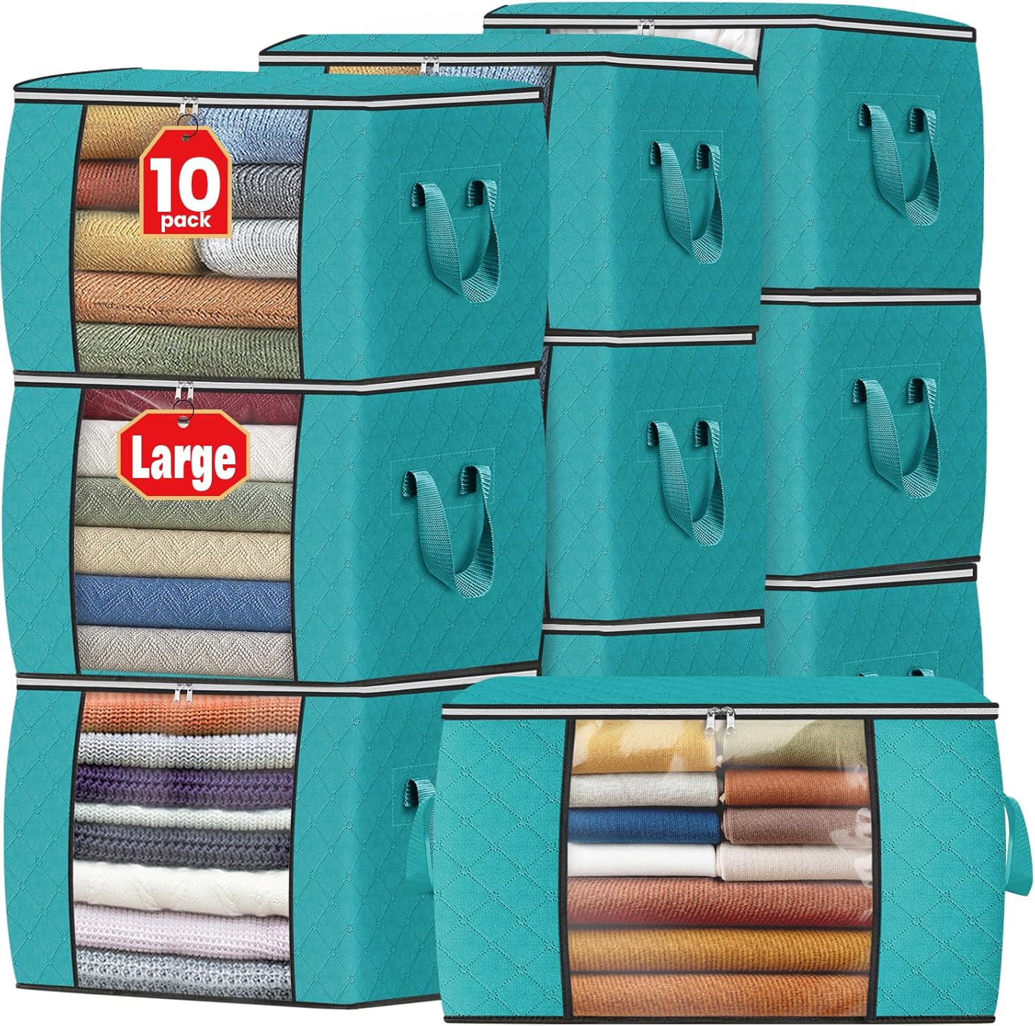Fab totes 24 Gallons Clothes Storage, Foldable Thick Fabric Blanket Storage Bags, Containers for Organizing Bedroom, Closet, Clothing, Comforter, Organization with Handle (10 Pack,Green)