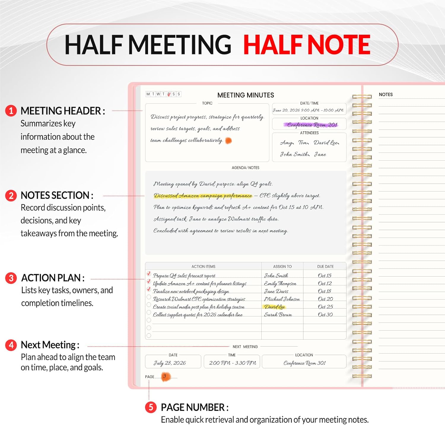- Meeting + Note Hybrid Layout: The Half Meeting Half Note format blends structured agenda tracking with free-flow idea capture—boosting both task clarity and creative thinking in one streamlined meeting notebook