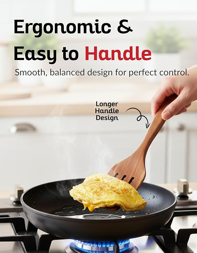 - Ergonomic, Eco-Friendly Kitchen Tools Designed with smooth sanded edges and a natural grip, these wooden spurtles provide comfort and precision for mixing, spreading, and serving. Lightweight yet strong, the teak kitchen tools reduce hand fatigue and are more sustainable than plastic or metal alternatives—perfect for eco-conscious home chefs.