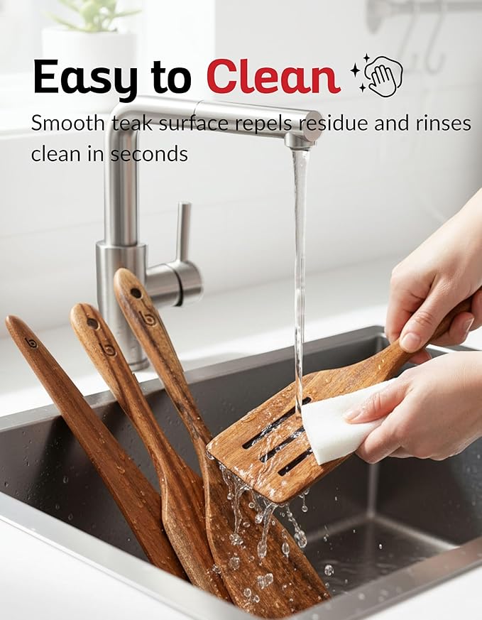 - Easy Care & Perfect Wooden Kitchen Gift Naturally resistant to stains and odors, these wooden utensils clean easily with warm water and mild soap. Finished with a rustic, elegant look, this wooden spurtle set doubles as serving tools and makes a thoughtful gift for weddings, housewarmings, or holidays—ideal for anyone who loves premium teak wood cooking utensils.