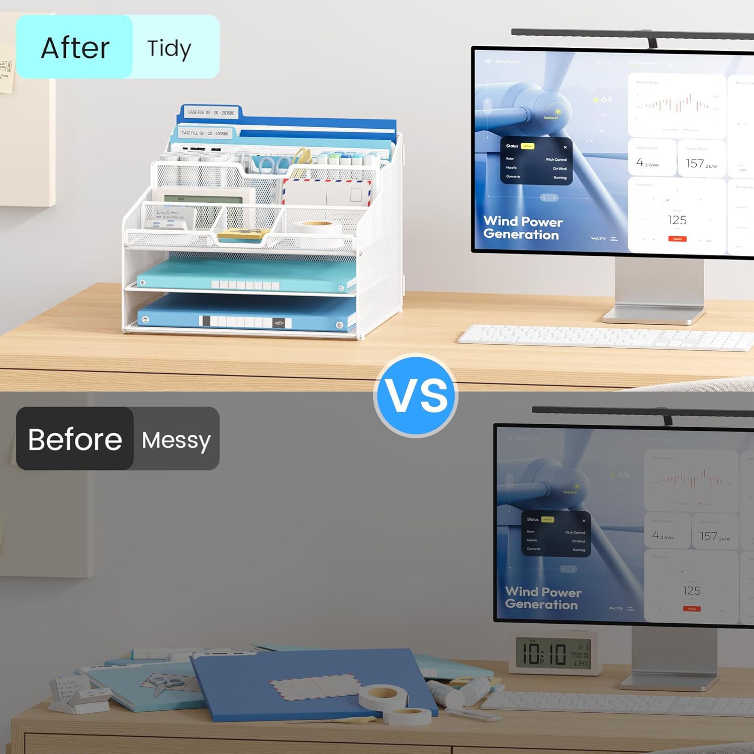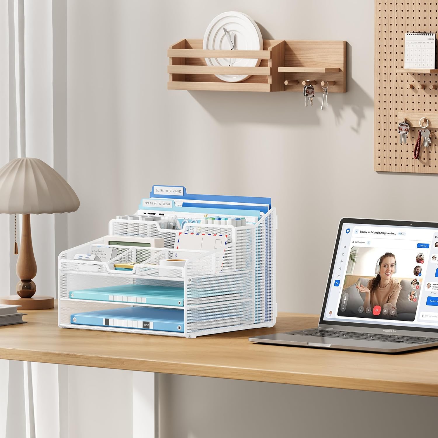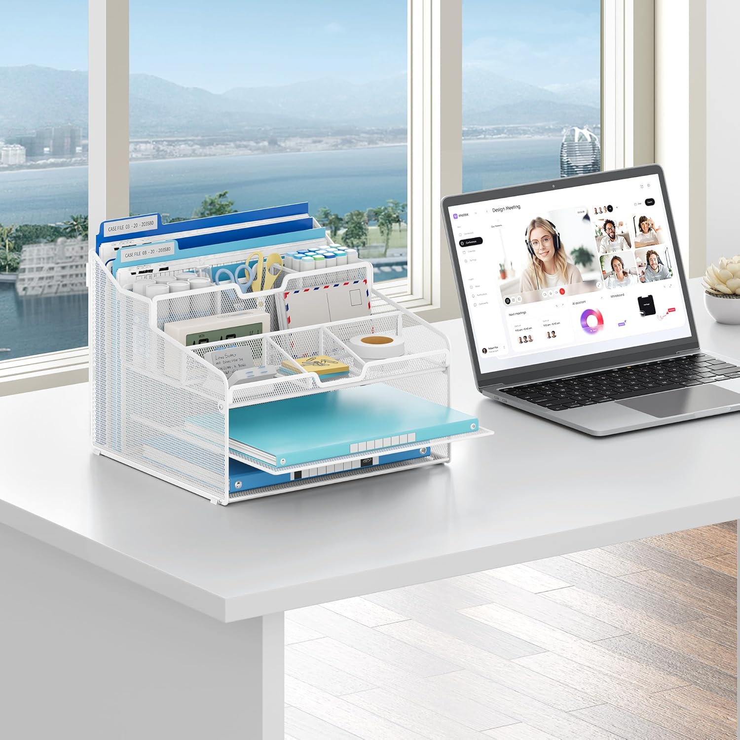 Lavatino Desk Paper File Organizer - Metal Mesh with 2 Letter Trays, 7 Flexible Dividers, 2 Vertical File Folder Holders for Office/Home/Classroom Supplies, Desk Organizers and Accessories, White