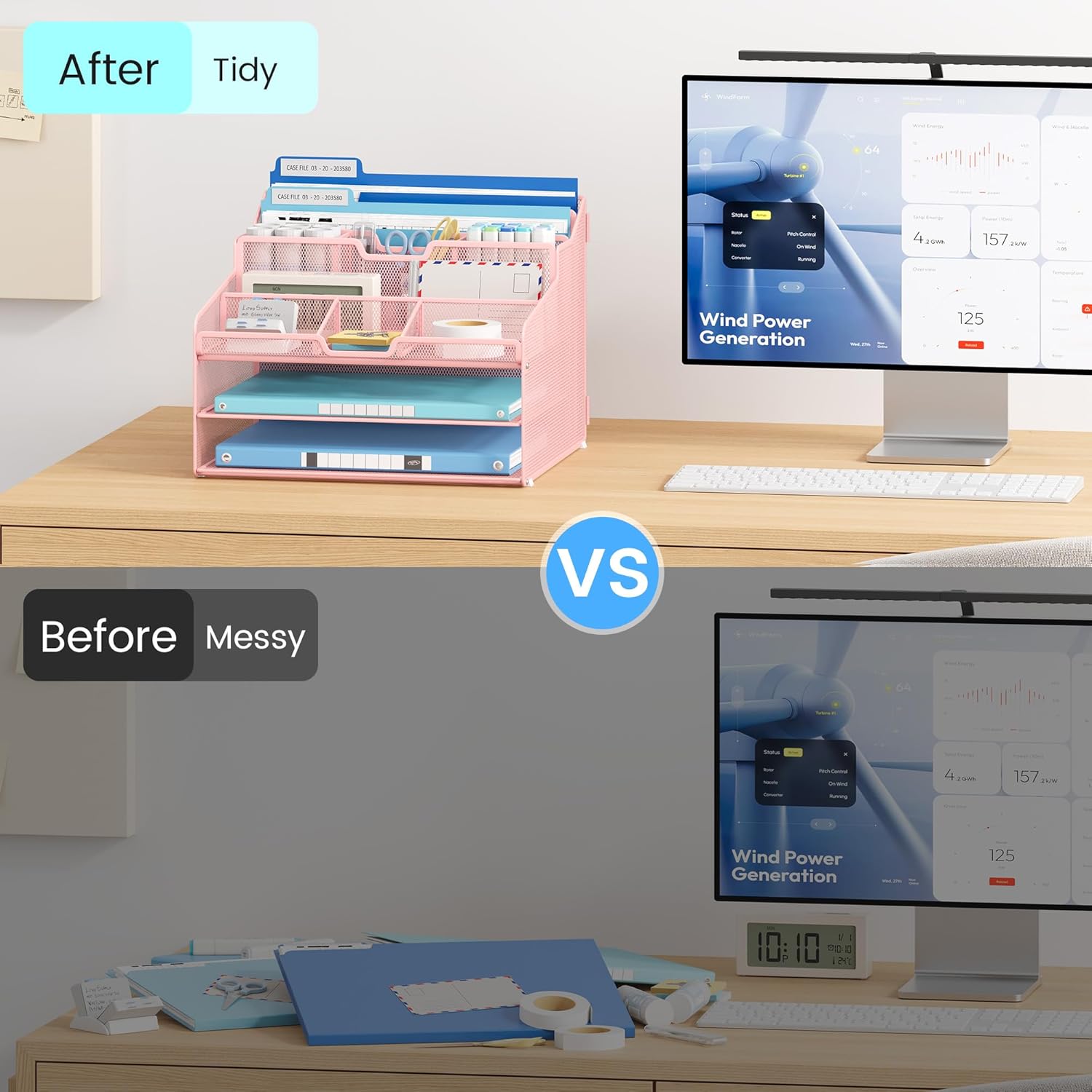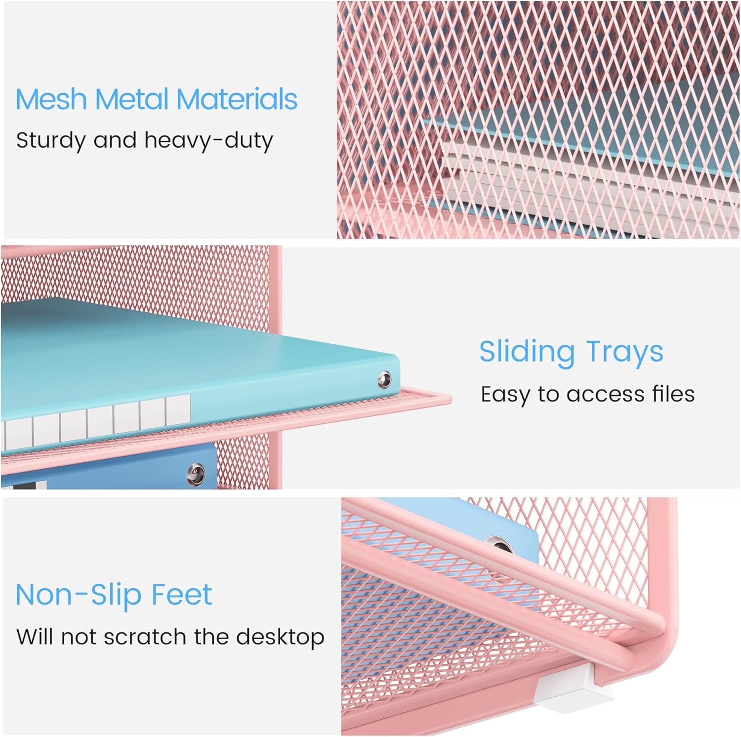 Lavatino Desk Paper File Organizer - Metal Mesh with 2 Letter Trays, 7 Flexible Dividers, 2 Vertical File Folder Holders for Office/Home/Classroom Supplies, Desk Organizers and Accessories, Pink