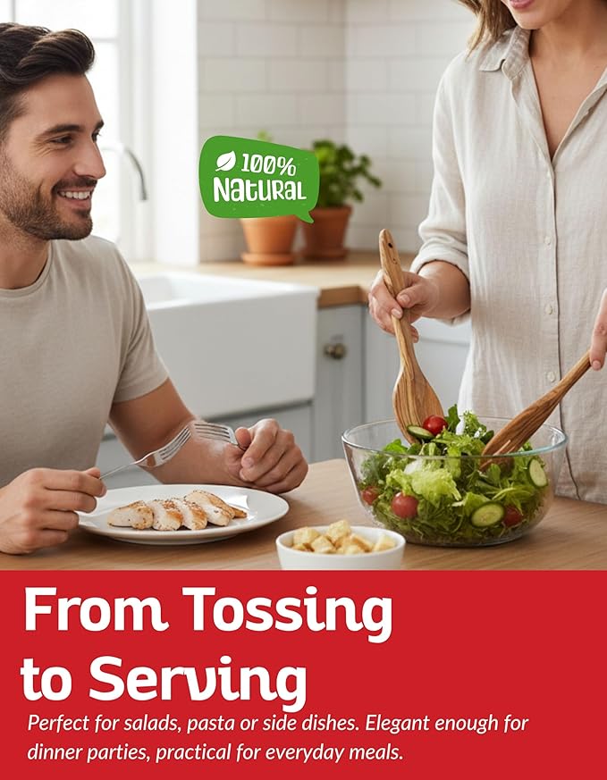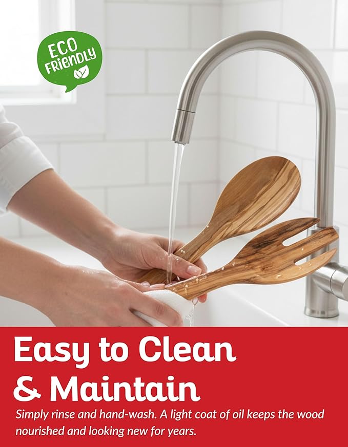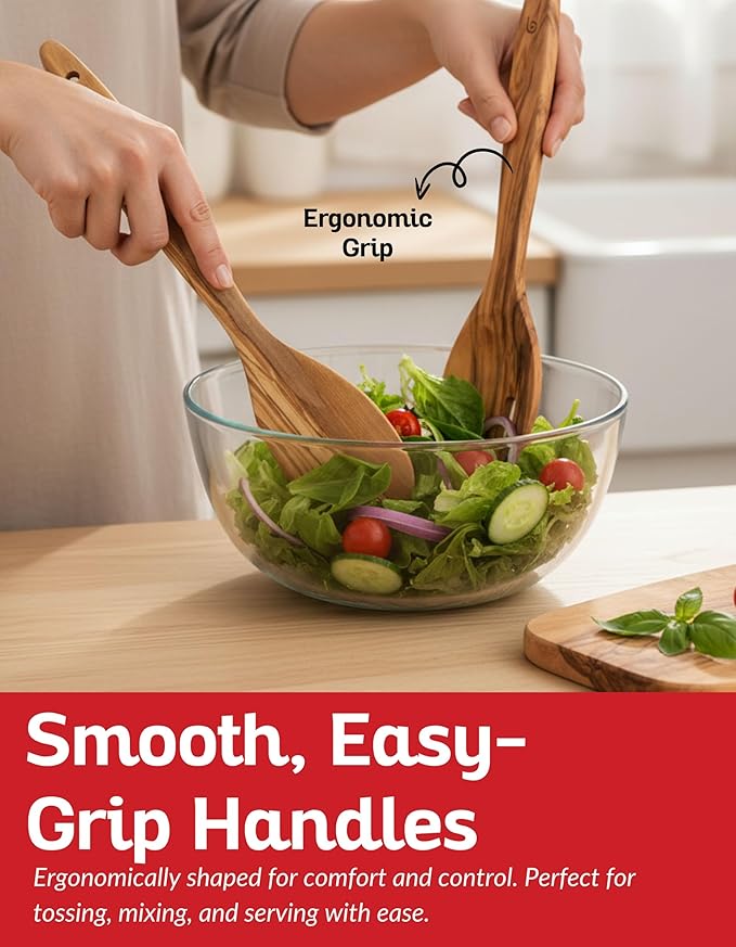 - Eco-Friendly & Food Safe – Sustainable olive wood utensils are BPA-free, chemical-free, and eco-conscious. With a smooth, polished finish, these natural wooden cooking tools are comfortable to hold, splinter-free, and ideal for reducing plastic in the kitchen while enjoying premium handcrafted kitchenware.