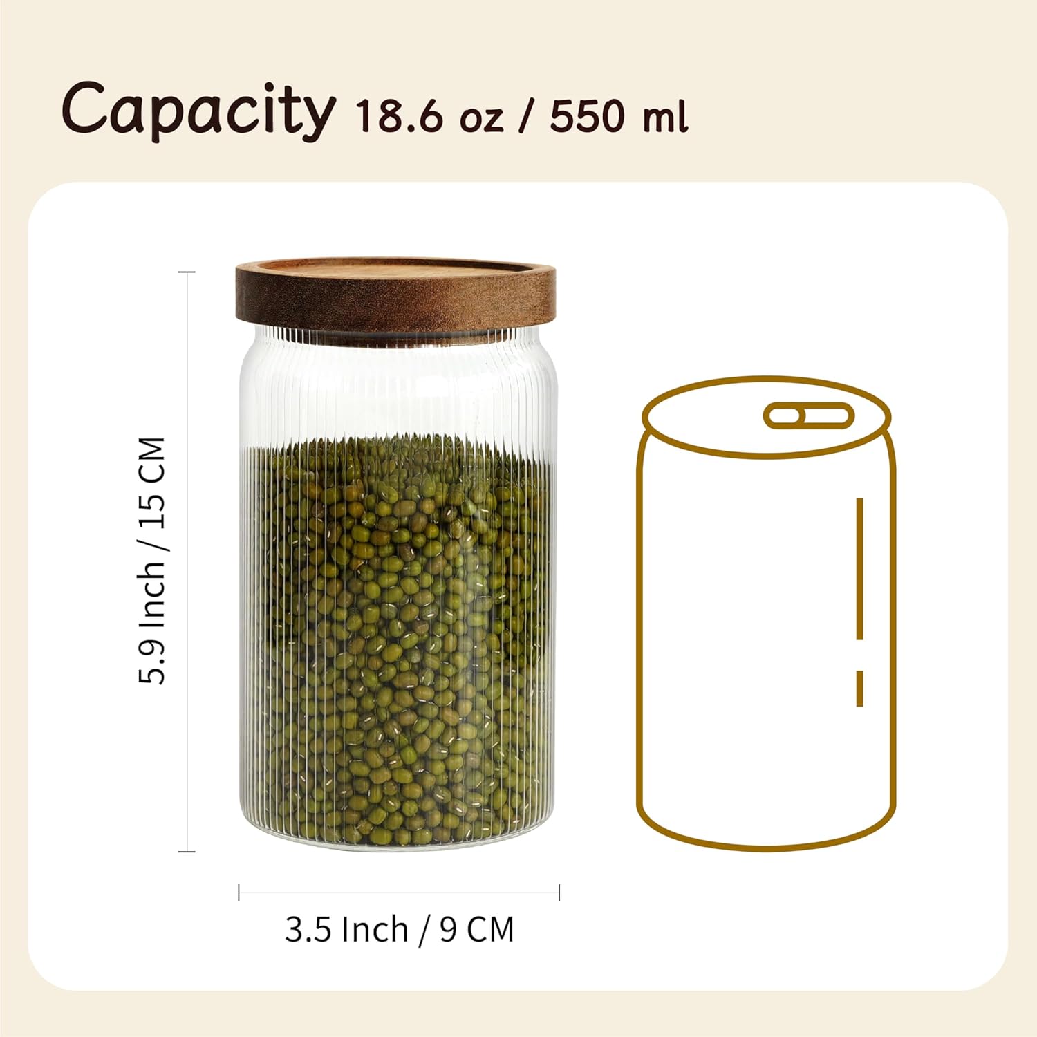 Ribbed Glass Storage Jars Set of 2 – Airtight Food Canisters with Wooden Lids, Stackable Kitchen Organizers for Coffee, Tea, Spices & Dry Goods (18.6oz)