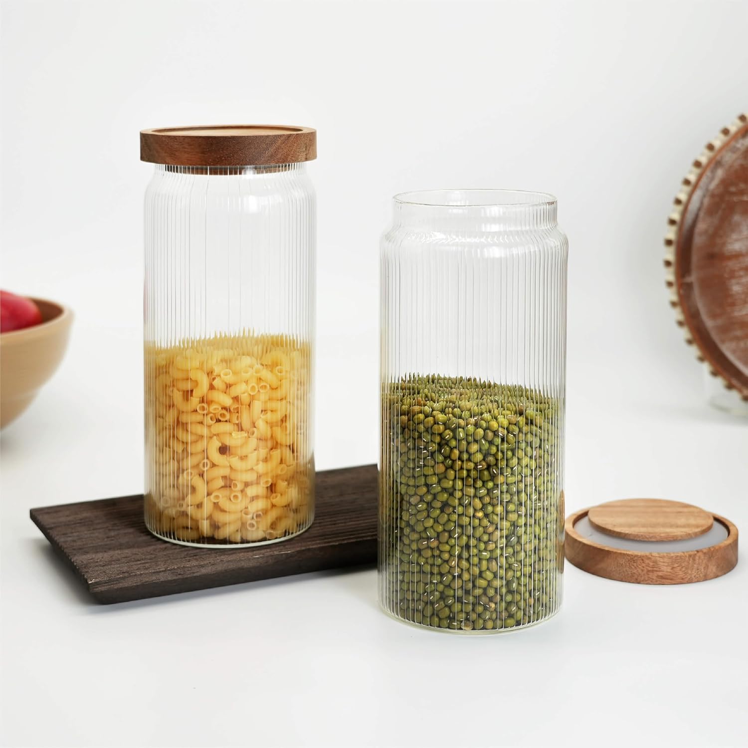 Ribbed Glass Storage Jars Set of 2 – Airtight Food Canisters with Wooden Lids, Stackable Kitchen Organizers for Coffee, Tea, Spices & Dry Goods (25.4oz)