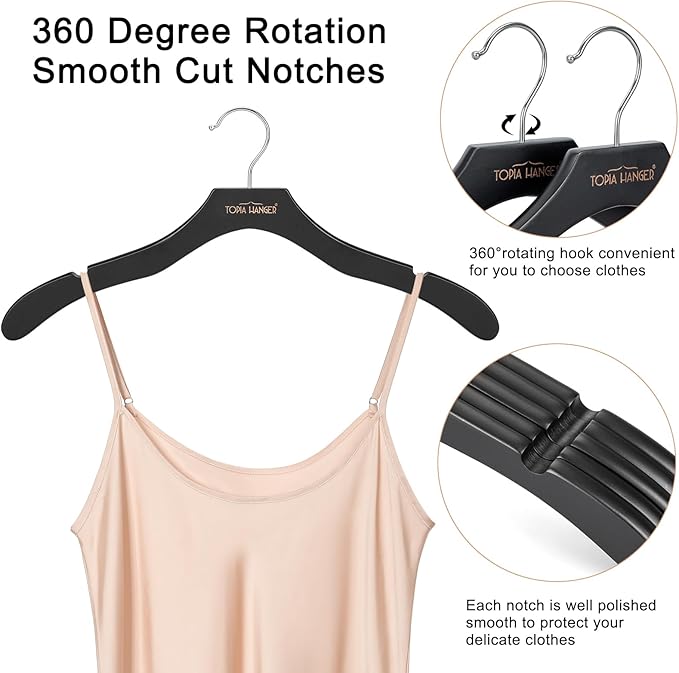 TOPIA HANGER Wooden Coat Hangers 12 Pack, Premium Wood Suit Sweater No Shoulder Bump Hangers, 360° Swivel Hook and Cut Notches Clothes Hangers for Sweater, Hoodie, Shirts, Jackets, Dress, Black CT84B
