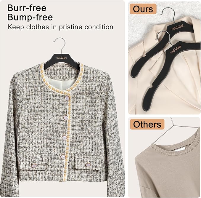 - Ergonomic Design & No Shoulder Bump: Wooden clothes hangers designed according to the shape of the human body, which keep your clothes in nice shape and wrinkle free, keeping shoulder no bulges. Single suit hanger size is 17 X 8.07 X 0.43 inch