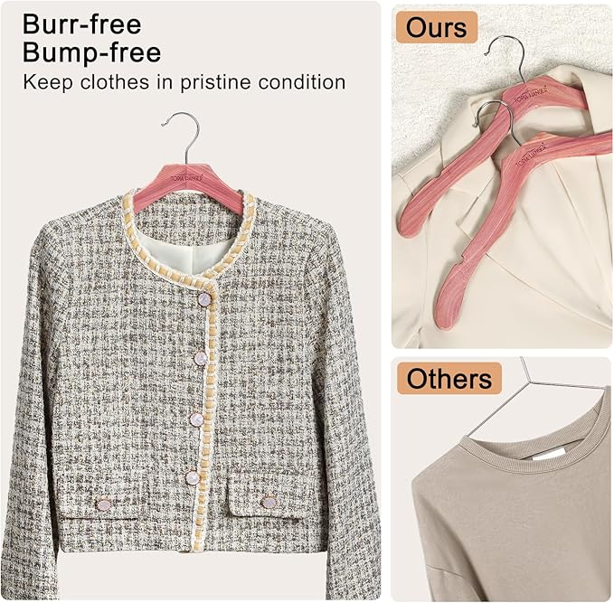 - Ergonomic Design & No Shoulder Bump: Wooden clothes hangers designed according to the shape of the human body, which keep your clothes in nice shape and wrinkle free, keeping shoulder no bulges. Single suit hanger size is 17 X 8.07 X 0.43 inch