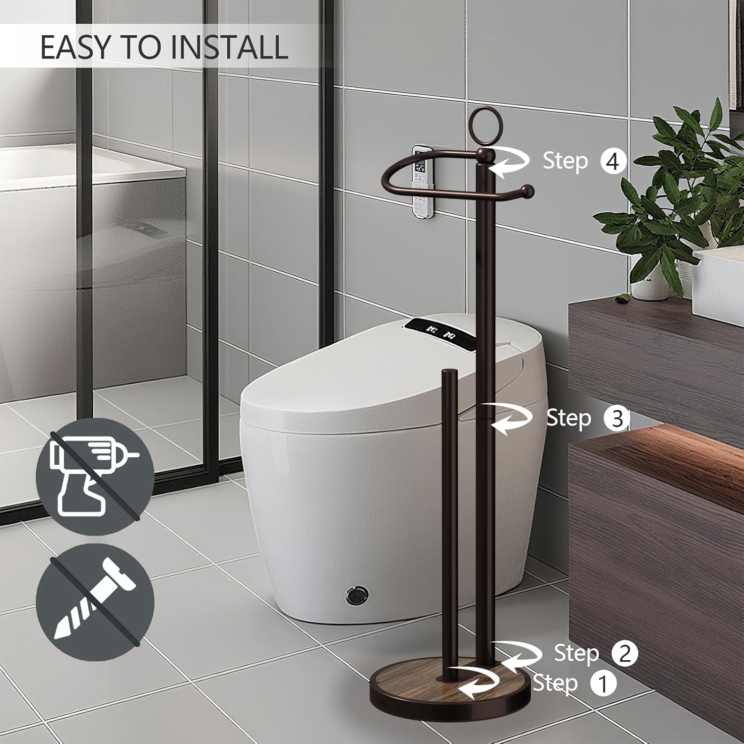 - 【Space-Saving Design】This freestanding toilet paper holder features a movable design, allowing you to place it anywhere in your bathroom. With a 23-inch main bar, it conveniently holds 3-4 rolls of tissue, keeping them within easy reach while maximizing space efficiency.