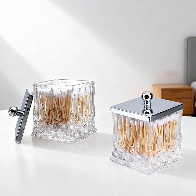 - Glass Qtip Holder with Lid: It's a glass jar with silver lid that does its job well. The lid screws on tight to keep moisture out, making it a reliable cotton ball container and q tip dispenser for your daily routine.