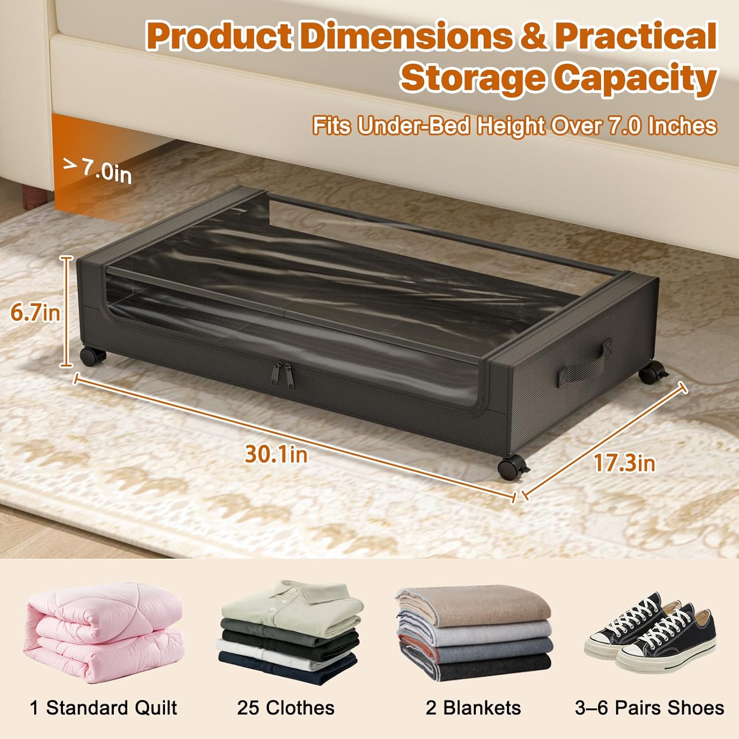 - Transparent Window & Label Design: The rolling under-bed storage bins feature transparent lid windows and label slots, making it easy to identify contents without opening multiple containers. This design helps prevent misstorage and ensures you can quickly locate items. The double zipper bottom and high-quality material keep dust, moisture, and dirt out, keeping your items clean and organized.